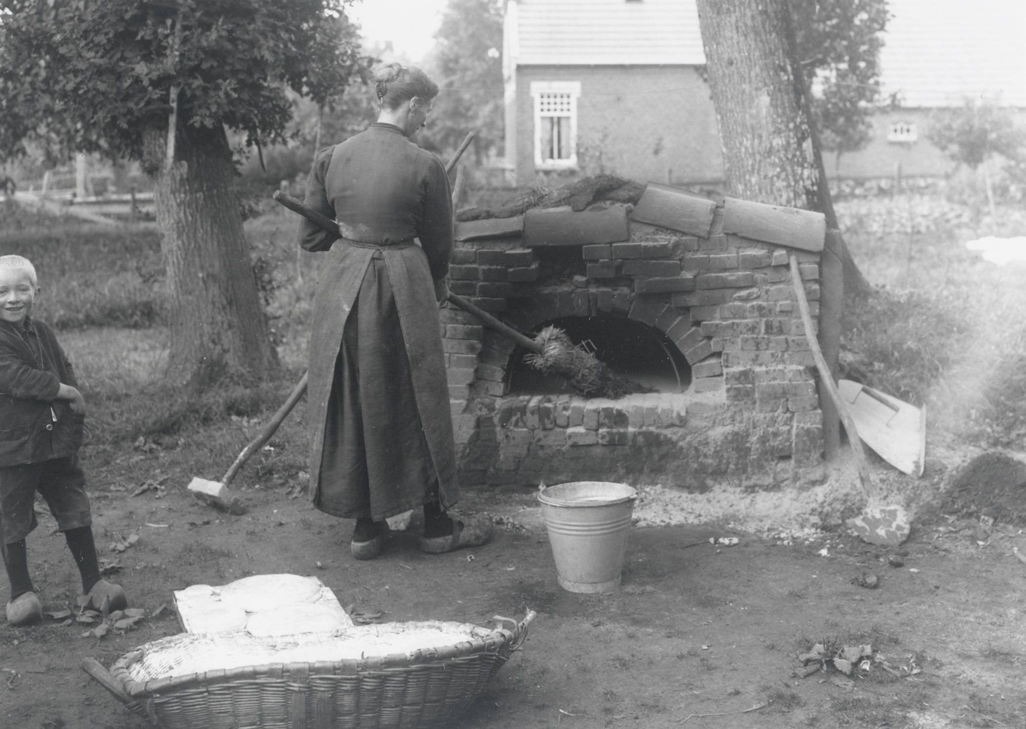 Bakoven in Borger. De oven wordt met de bezem schoongeveegd. Op de voorgrond liggen in de wan de broden die straks in de oven zullen worden geschoten.
