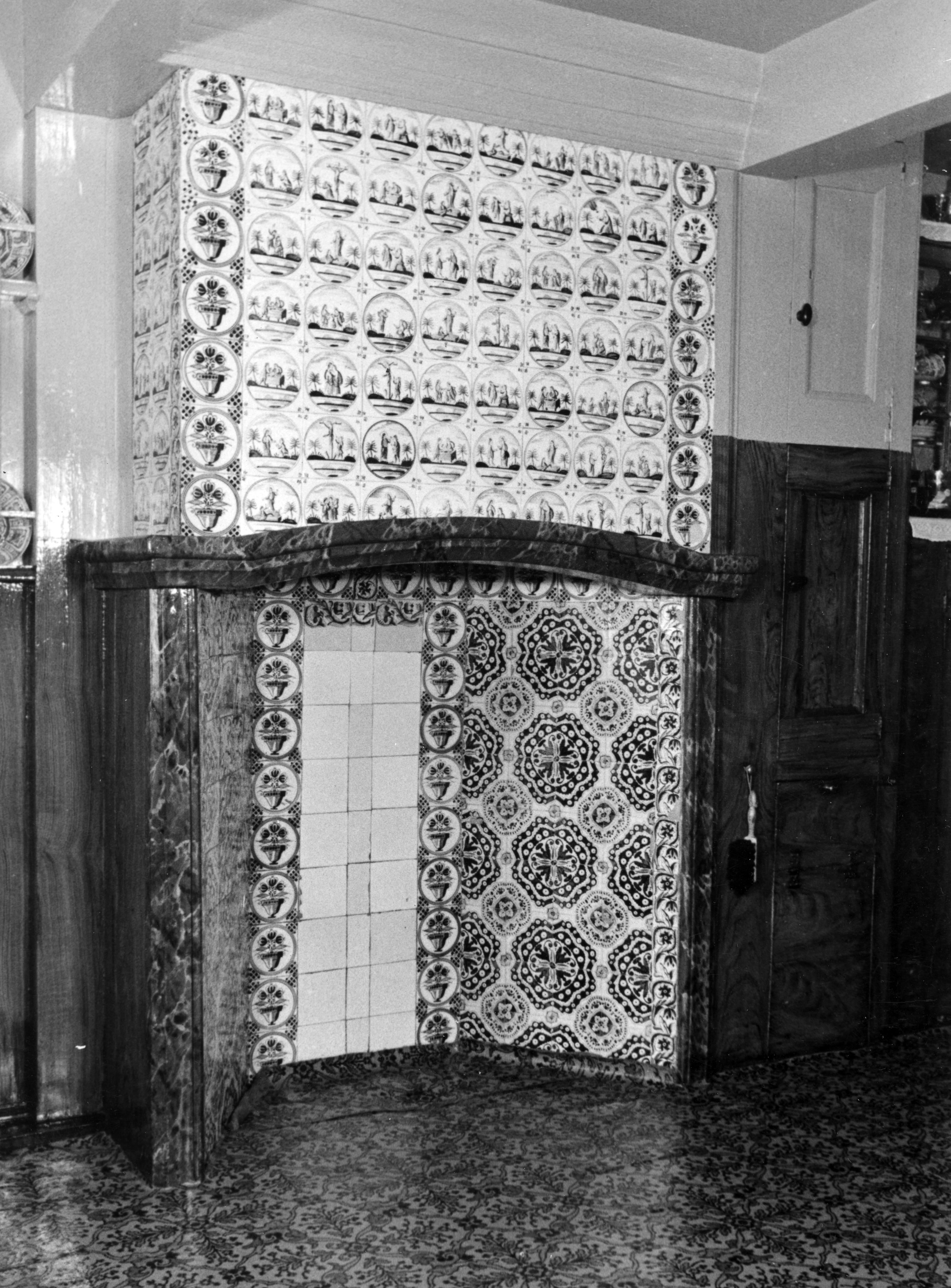 Betegelde schouw met sierlijsten van gemarmerd hout in een woning op Marken.