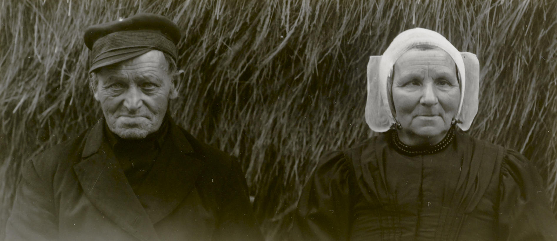 Het echtpaar Gies Hilhorst (1851-1935) en Aaltje Hilhorst-Stalenhoef (1854-1940) in streekdracht uit Eemnes. Aaltje draagt de zogenoemde vierkante muts.