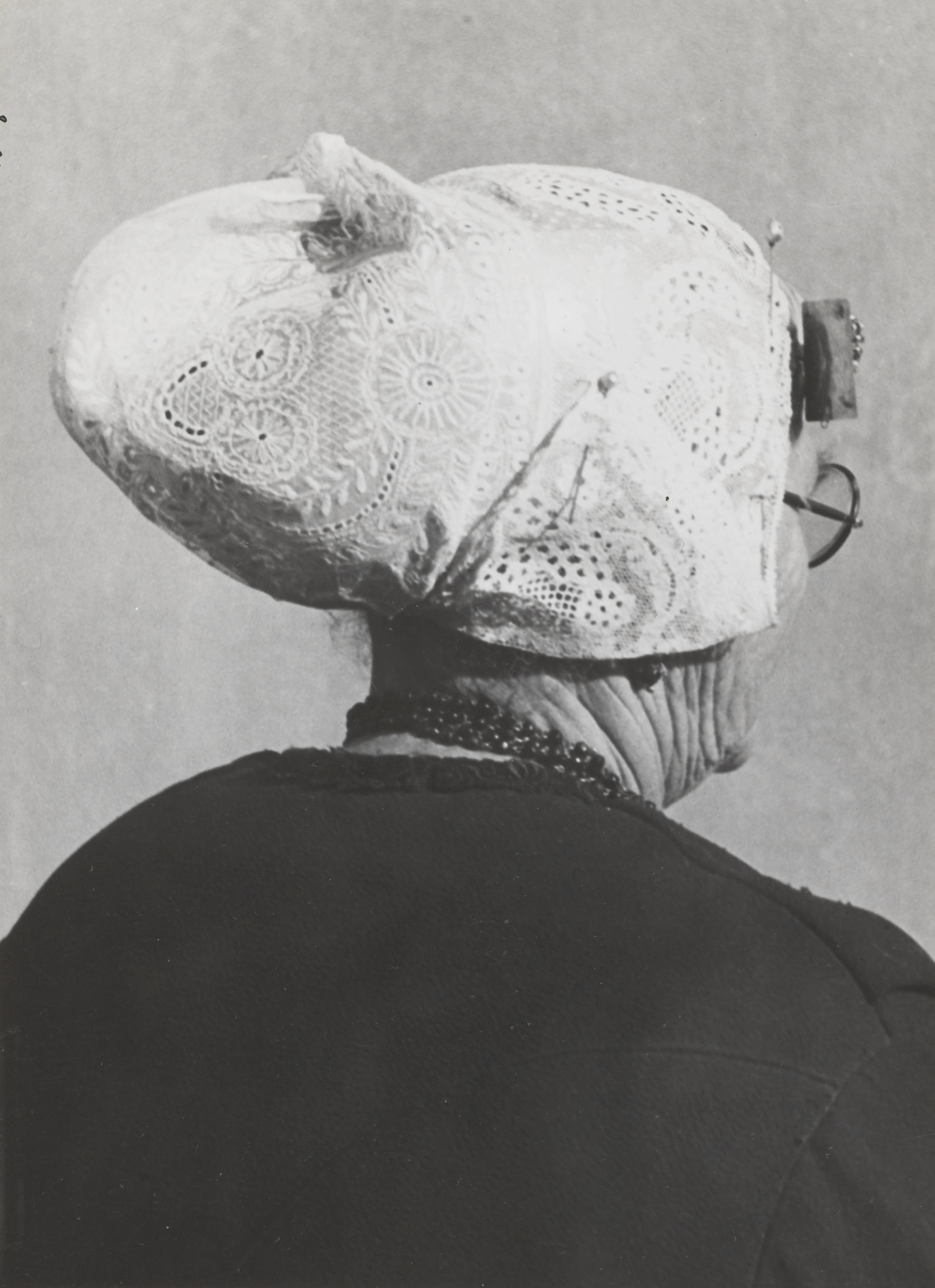 Mevrouw Kuijt uit Katwijk aan Zee. Ze is gekleed in zondagse dracht. Ze draagt over een ondermuts haar zilveren oorijzer met aan de beide uiteinden rechthoekige gouden 'boeken', versierd met cantillewerk. Over het oorijzer draagt ze een hul (muts) met fijngeplooide voorstrook en opgespelde punten. Achter de boeken is een paar mutsspelden in de muts ...