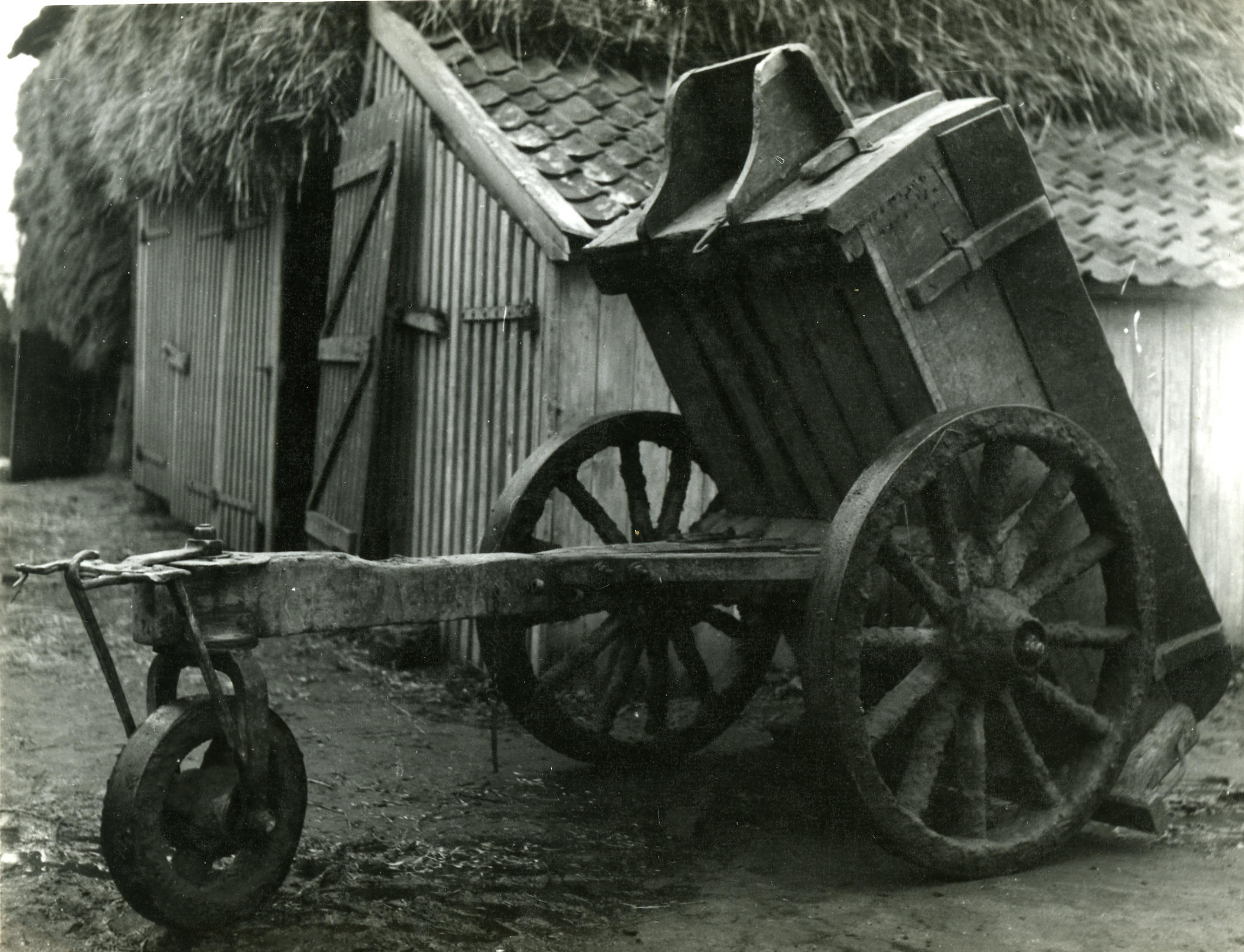 Driewielige stortkar bij een boerderij in Veessen.