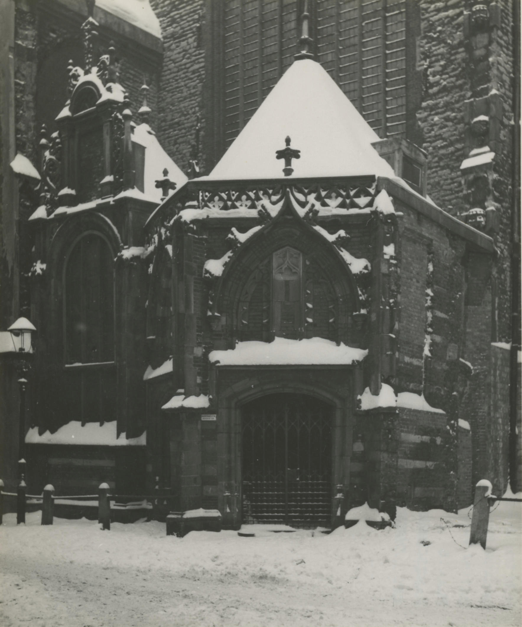 Ingangspartij Oude Kerk, Amsterdam, in februari 1947 (zwart-wit foto)
