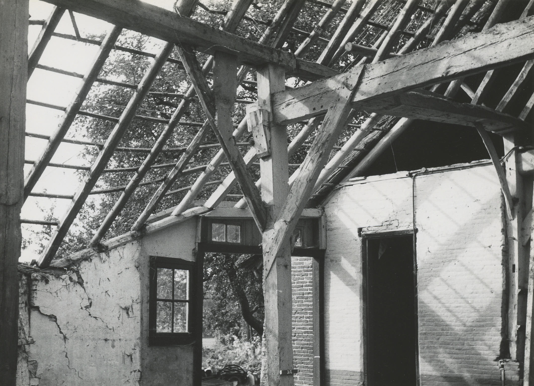 Afbraak van een boerderij, Giethoorn, 1957 (zwart-wit foto)