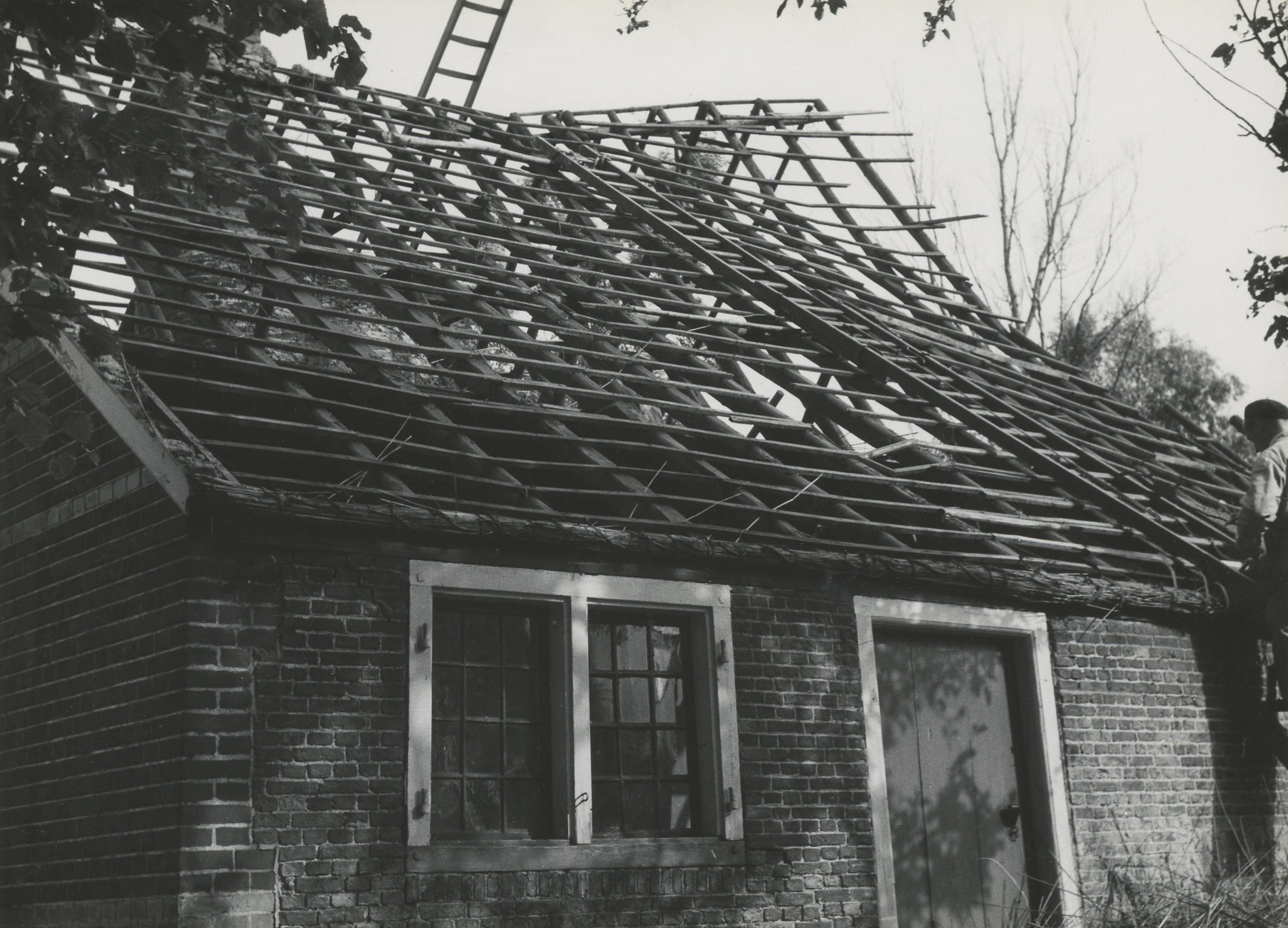 Afbraak van een boerderij in Giethoorn. Op de foto staat de rechterzijgevel van het woongedeelte. Het dak is al ontdaan van het riet. De voorgevel, links, is recenter gebouwd dan de zijmuur. De boerderij werd gebouwd in 1832. In 1957 is het pand afgebroken en overgebracht naar het Nederlands Openluchtmuseum in Arnhem.