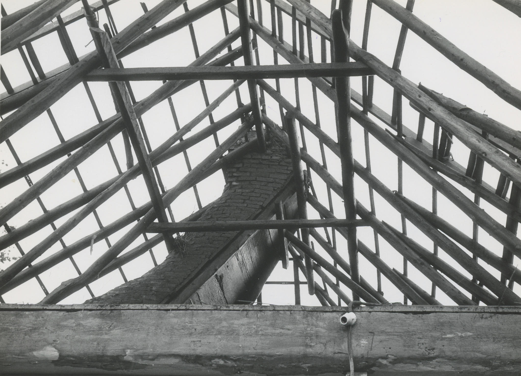 Afbraak van een boerderij in Giethoorn. Het dak boven het woongedeelte is ontdaan van het riet. Het stenen rookkanaal steunt op een houten constructie. De boerderij werd gebouwd in 1832. In 1957 is het pand afgebroken en overgebracht naar het Nederlands Openluchtmuseum in Arnhem.