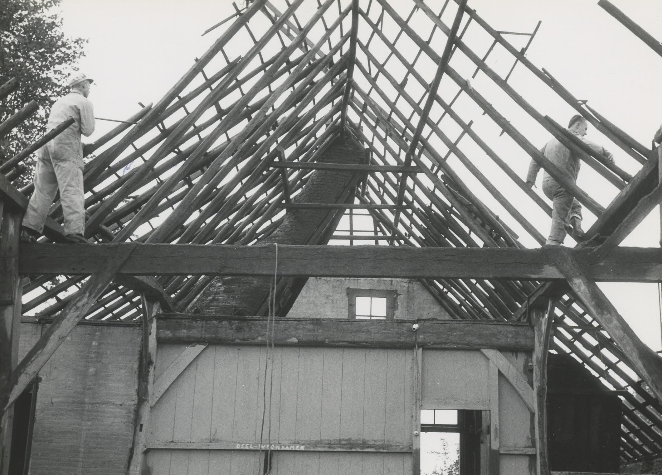 Afbraak van een boerderij in Giethoorn. De houten wand vormt de afscheiding van de woonkamer met het bedrijfsgedeelte. Twee museummedewerkers zijn aan het slopen. De boerderij werd gebouwd in 1832. In 1957 is het pand afgebroken en overgebracht naar het Nederlands Openluchtmuseum in Arnhem.