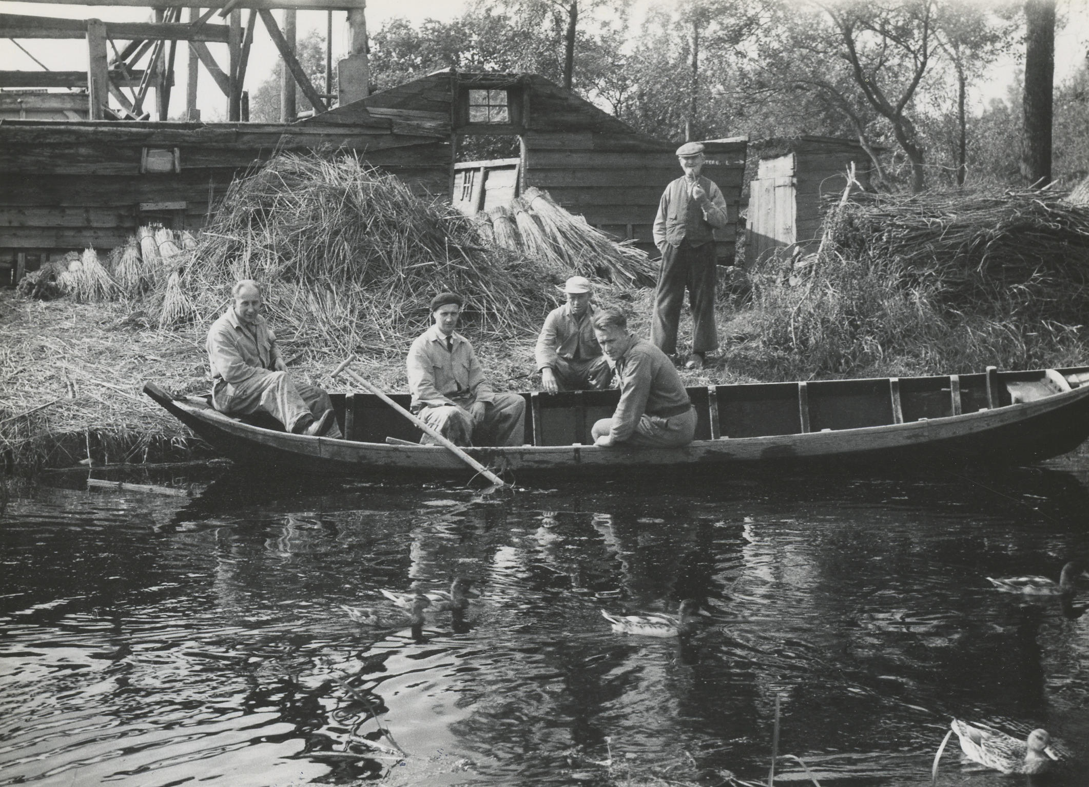 Medewerkers van het Nederlands Openluchtmuseum bij een punter, tijdens de afbraak van een boerderij in Giethoorn. In 1957 is het pand afgebroken en overgebracht naar het Nederlands Openluchtmuseum in Arnhem.