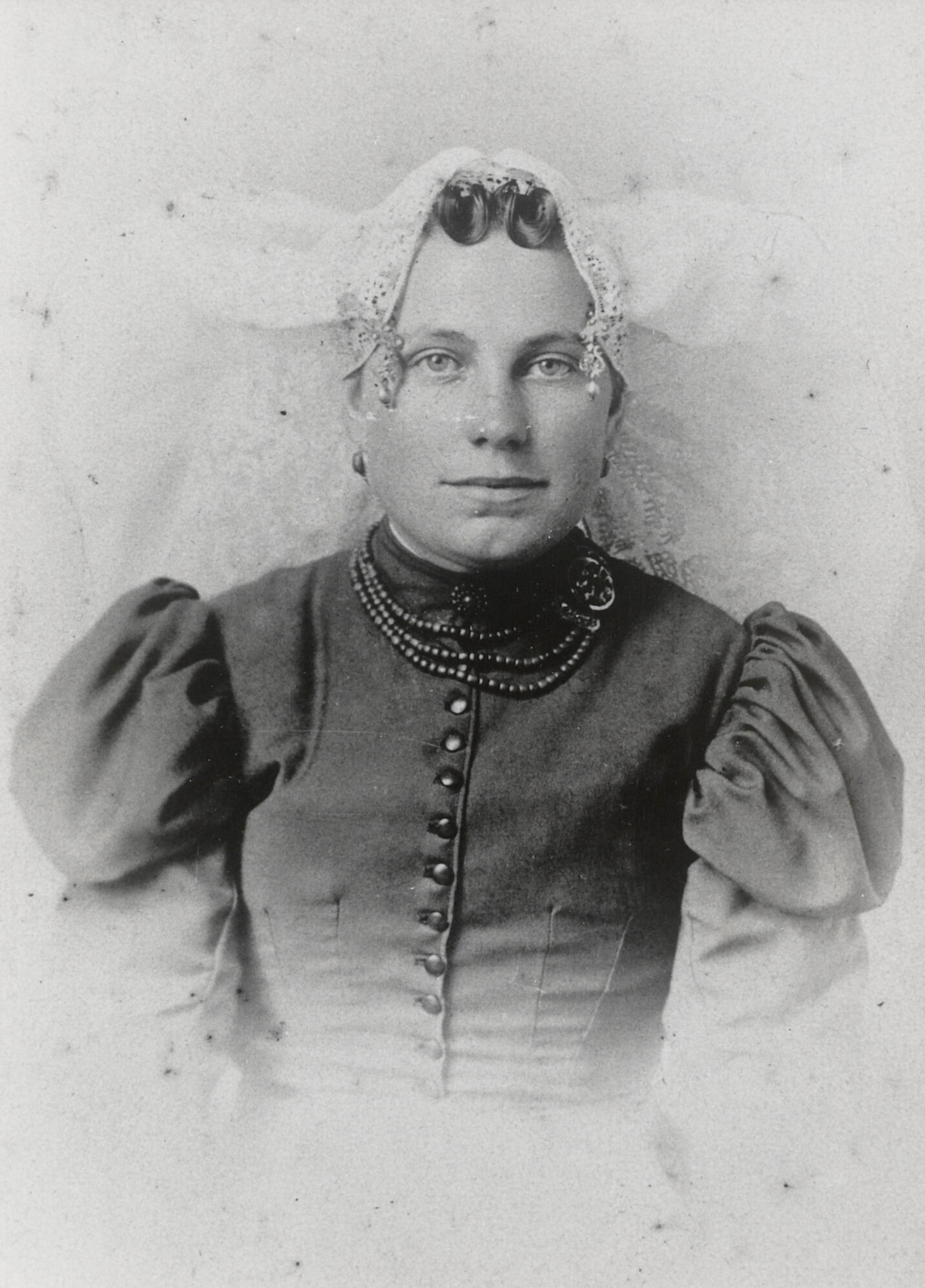 Vrouw in Duivelandse streekdracht uit Bruinisse. De vrouw draagt de lange muts met 'kuuf'. Het haar is in 'draaitjes' gelegd. De krullen van het oorijzer zitten achter de voorrand van de muts. Deze is vastgespeld achter de oren. De bellen aan het oorijzer hangen buiten de muts en bestaan uit drie delen. Het gouden bovenstukje ...