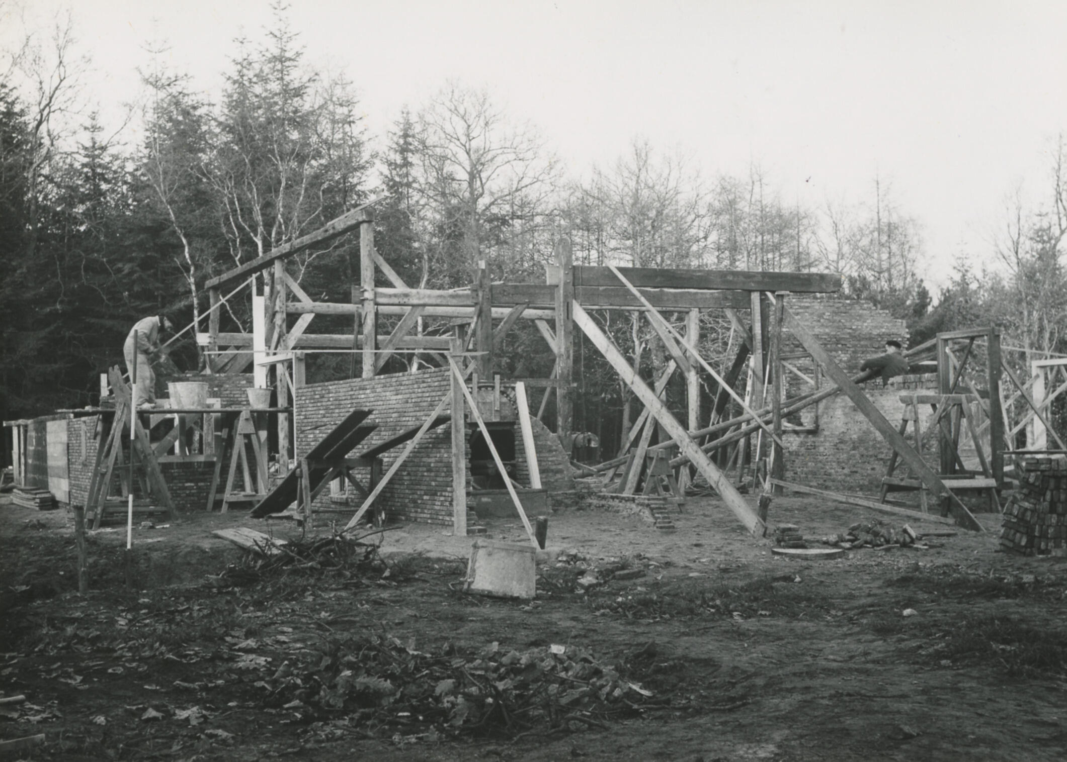 Herbouw van een boerderij uit Giethoorn in het Nederlands Openluchtmuseum, 1957 (zwart-wit foto)