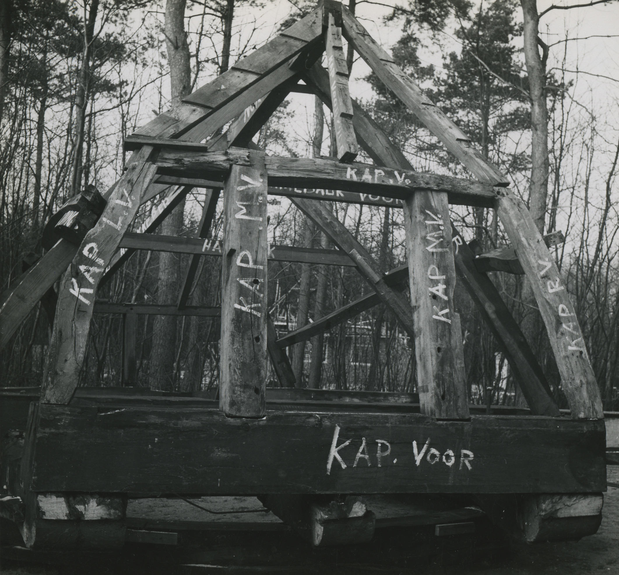 Herbouw van een poldermolen uit Noordlaren in het Nederlands Openluchtmuseum, 1958 (zwart-wit foto)