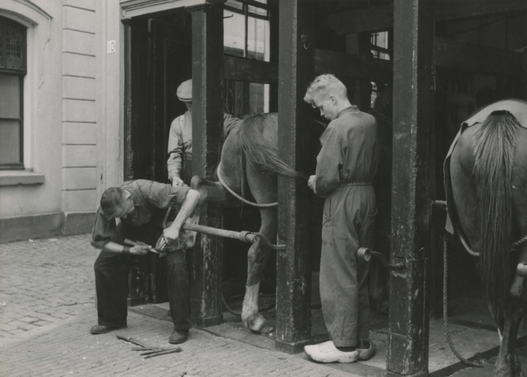 Hoefsmederij Poppe, Zwolle, 1958 (zwart-wit foto)