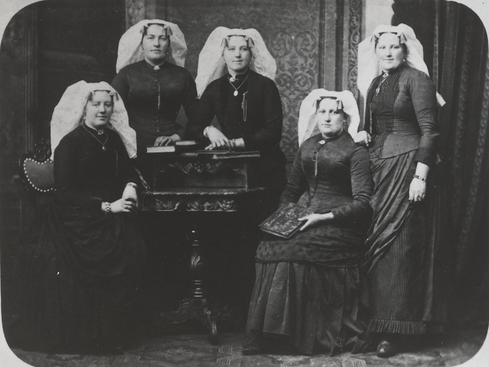 Vrouwen uit Geervliet in de dracht van Voorne-Putten, circa 1880 (zwart-wit foto)
