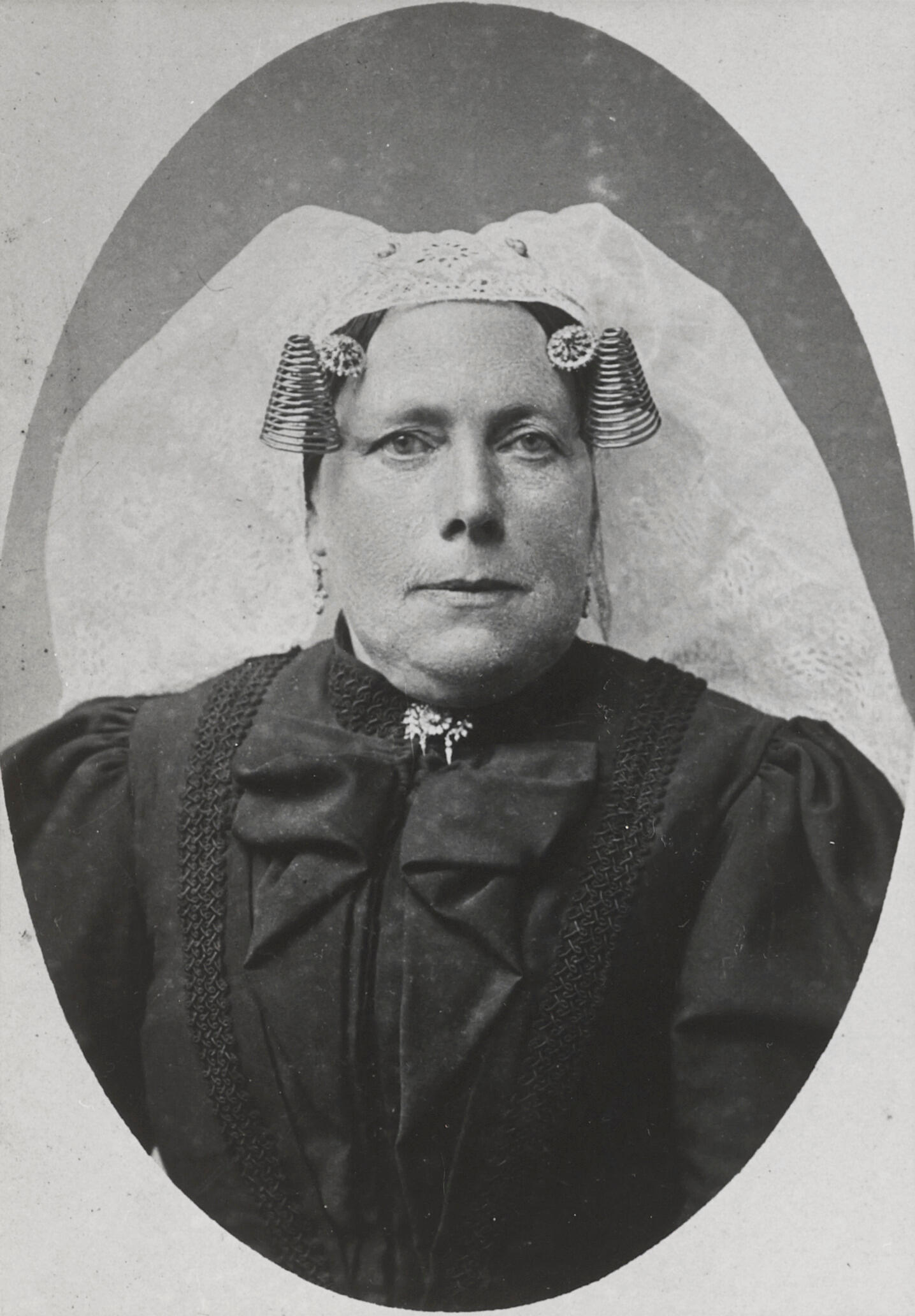 Vrouw in de streekdracht van Voorne-Putten. Onder de lange muts draagt ze een oorijzer met krullen aan de uiteinden. De krullen hebben vijftien windingen. De mutsspelden, broche en oorbellen zijn ingelegd met diamanten.