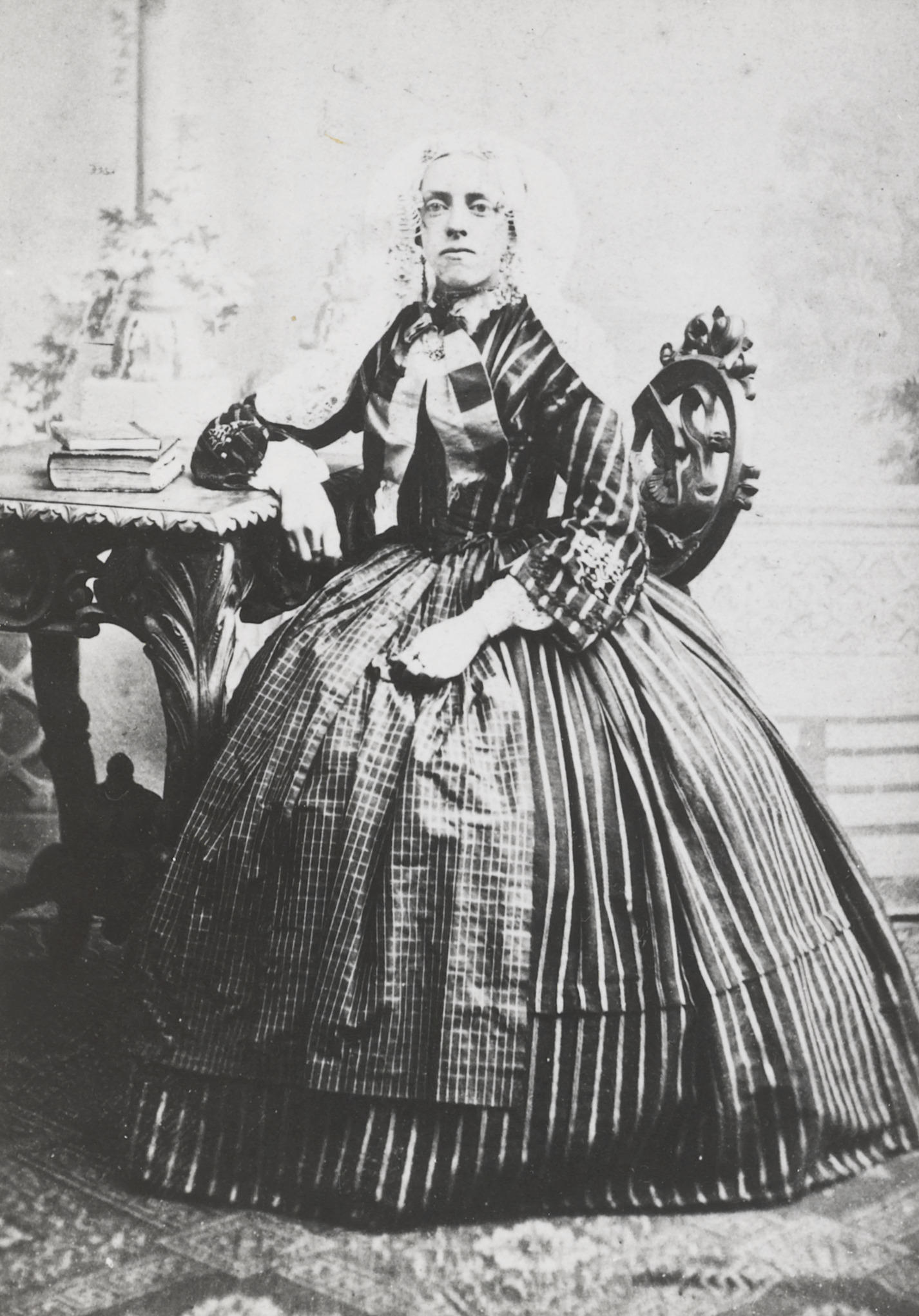 Vrouw in streekdracht uit Beijerland, circa 1865 (zwart-wit foto)