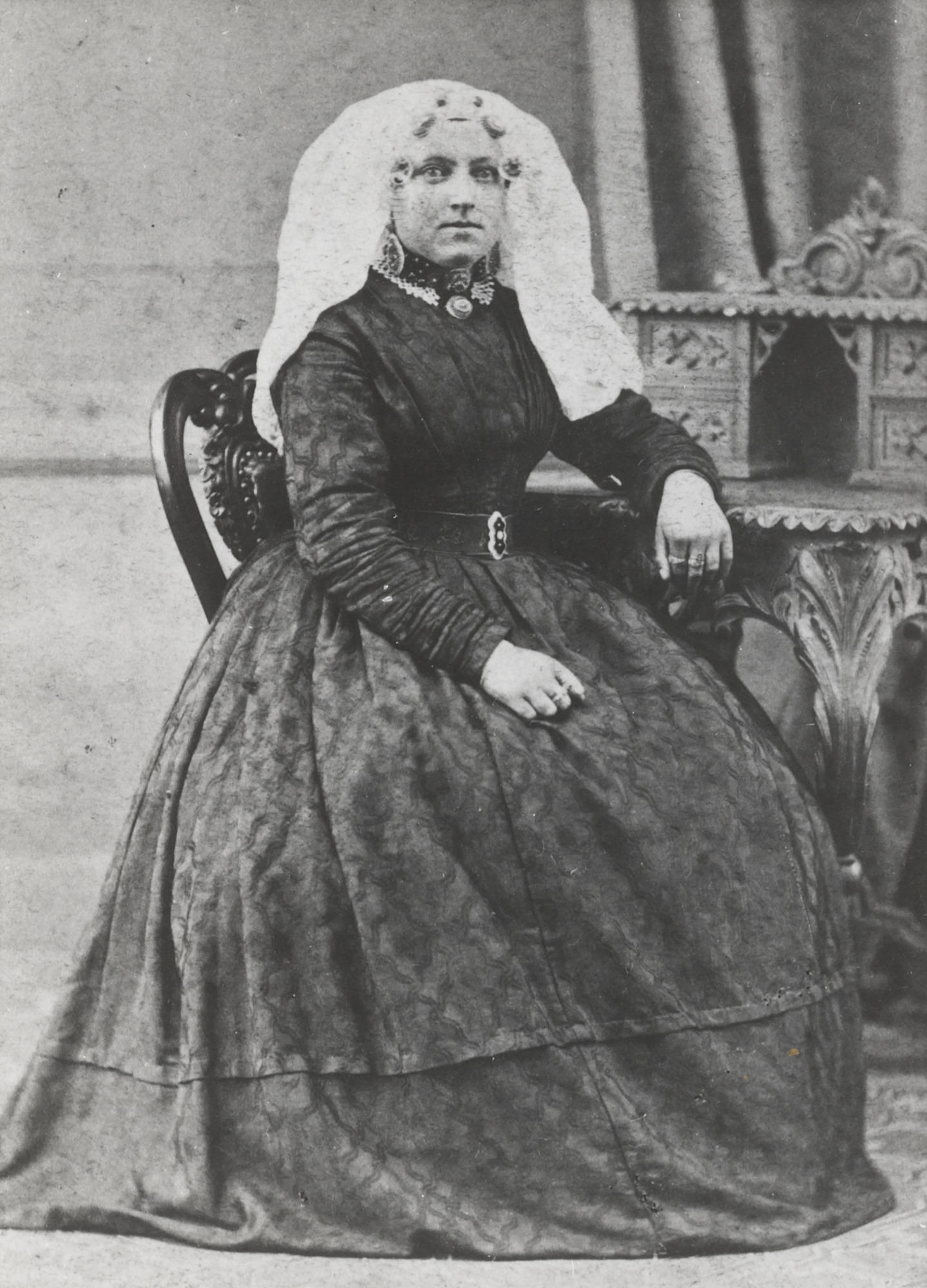 Vrouw in streekdracht uit Beijerland. De vrouw draagt onder de sluiermuts een oorijzer met krullen aan de uiteinden. Naast de krullen is een paar mutsspelden in de muts gestoken. Boven op de muts zijn nog twee paar spelden gestoken. Verder draagt ze een halssnoer, oorbellen en een broche.