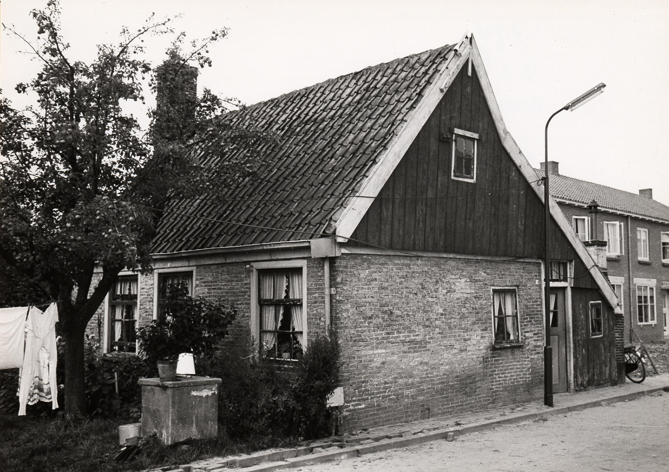 Voor- en zijgevel van een negentiende-eeuwse arbeiderswoning in Beemster, bewoond door een tuindersknecht. De woning is in 1958 overgebracht naar het Nederlands Openluchtmuseum in Arnhem. De woning had als adres Willem Molenaarstraat 21 en stond op de hoek met het Zuiderpad. In de tuin staat een regenput.