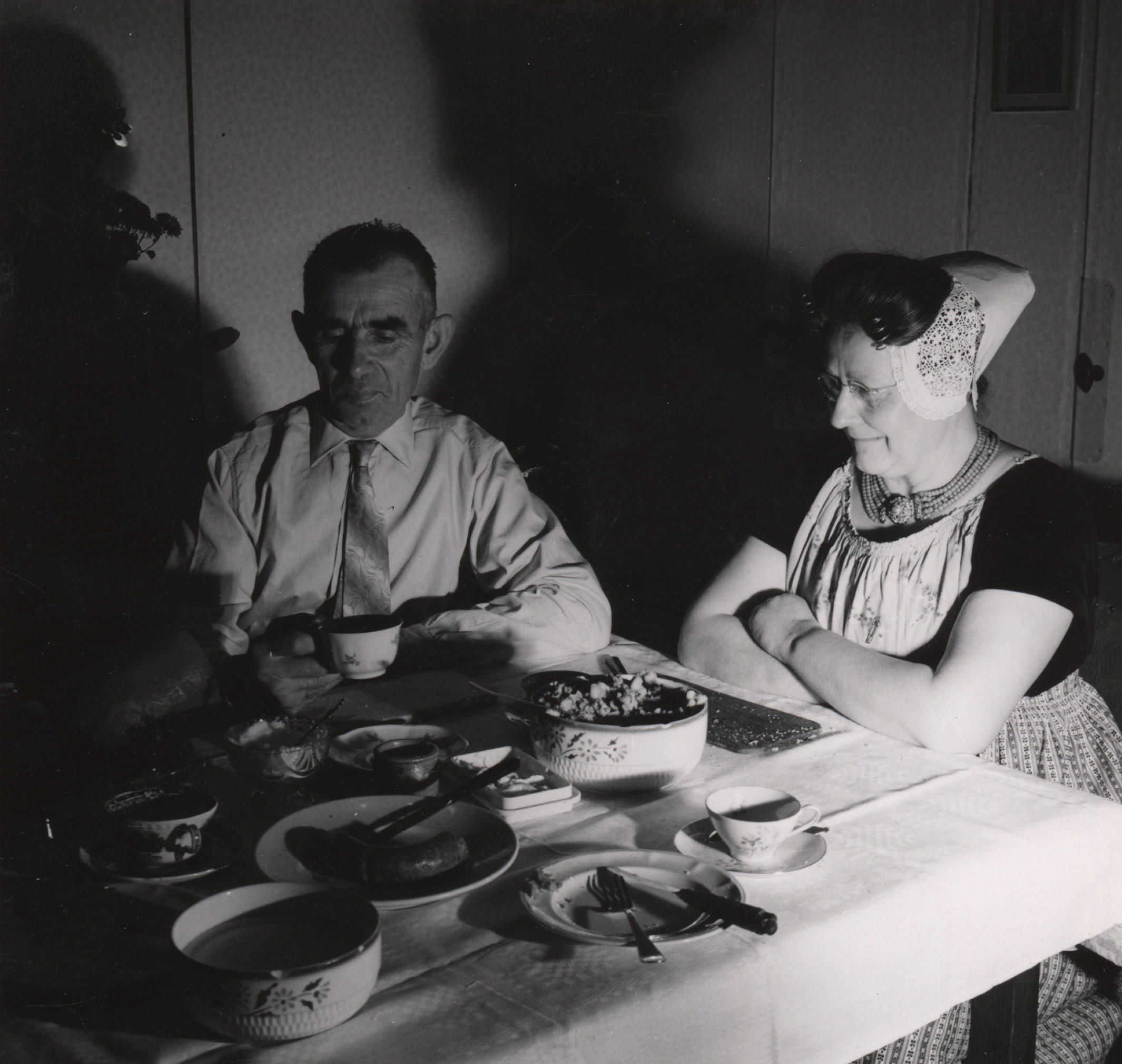 Echtpaar Castel aan de maaltijd, Oost Souburg, 1958 (zwart-wit foto)