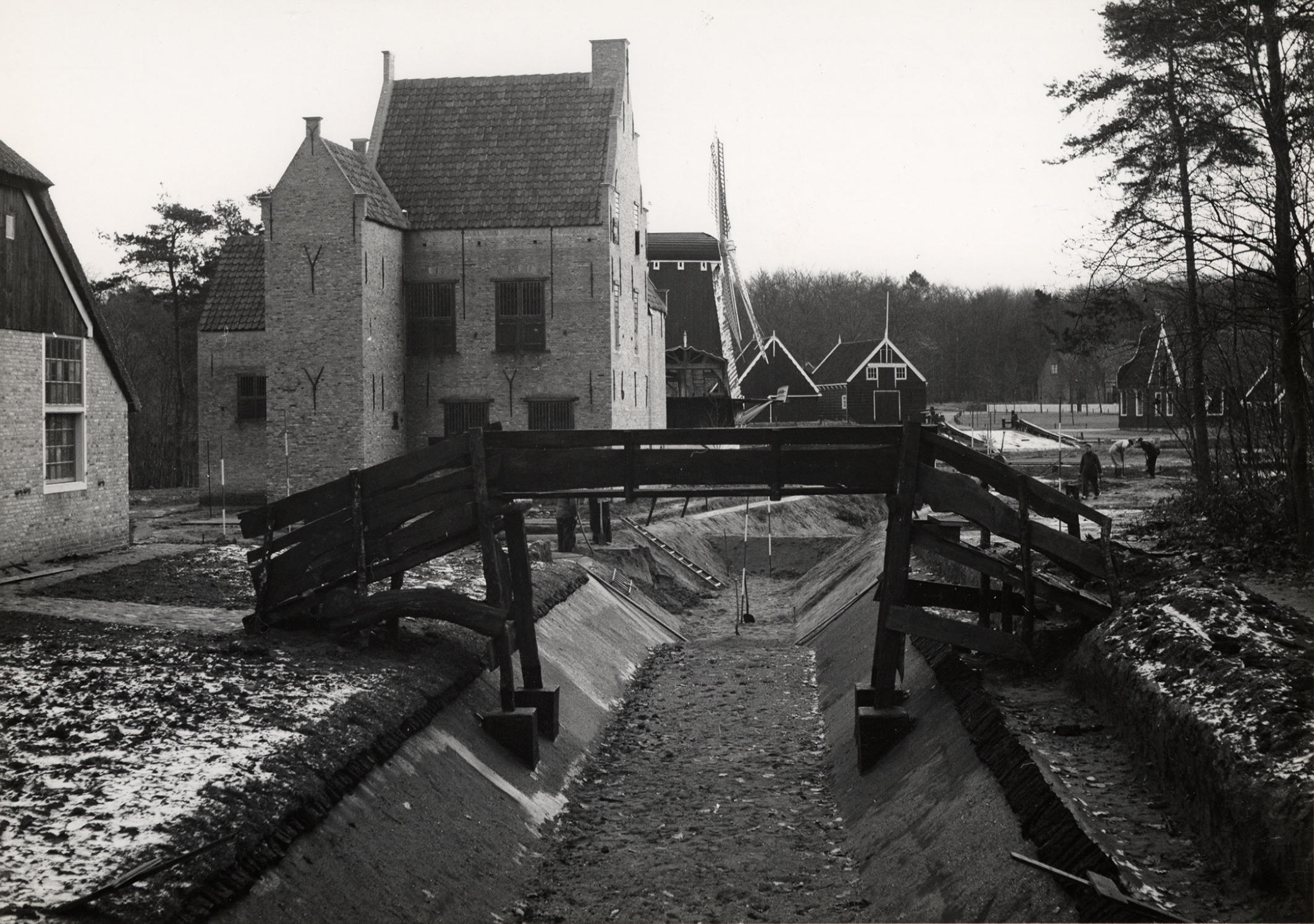 Inrichting van het terrein rond de herbouwde boerderij uit Giethoorn in het Nederlands Openluchtmuseum in Arnhem. In 1957 is het pand afgebroken en overgebracht naar het museum. De brug voor de boerderij is in 1958 speciaal gebouwd voor de film Fanfare van Bert Haanstra. Hij is aangekocht door het Nederlands Openluchtmuseum en in Arnhem geplaatst ...