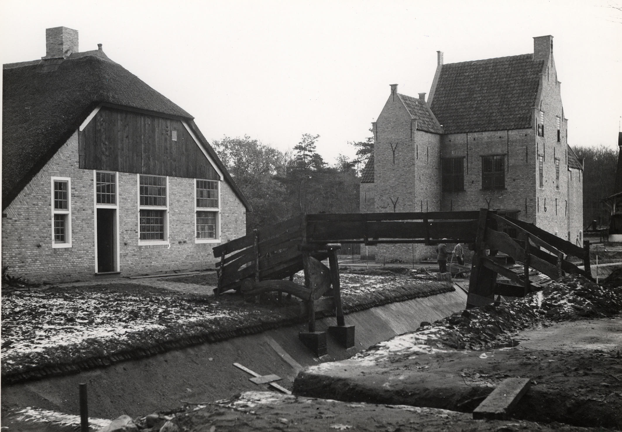 Inrichting van het terrein rond de herbouwde boerderij uit Giethoorn in het Nederlands Openluchtmuseum in Arnhem. In 1957 is het pand afgebroken en overgebracht naar het museum. De brug voor de boerderij is in 1958 speciaal gebouwd voor de film Fanfare van Bert Haanstra. Hij is aangekocht door het Nederlands Openluchtmuseum en in Arnhem geplaatst ...