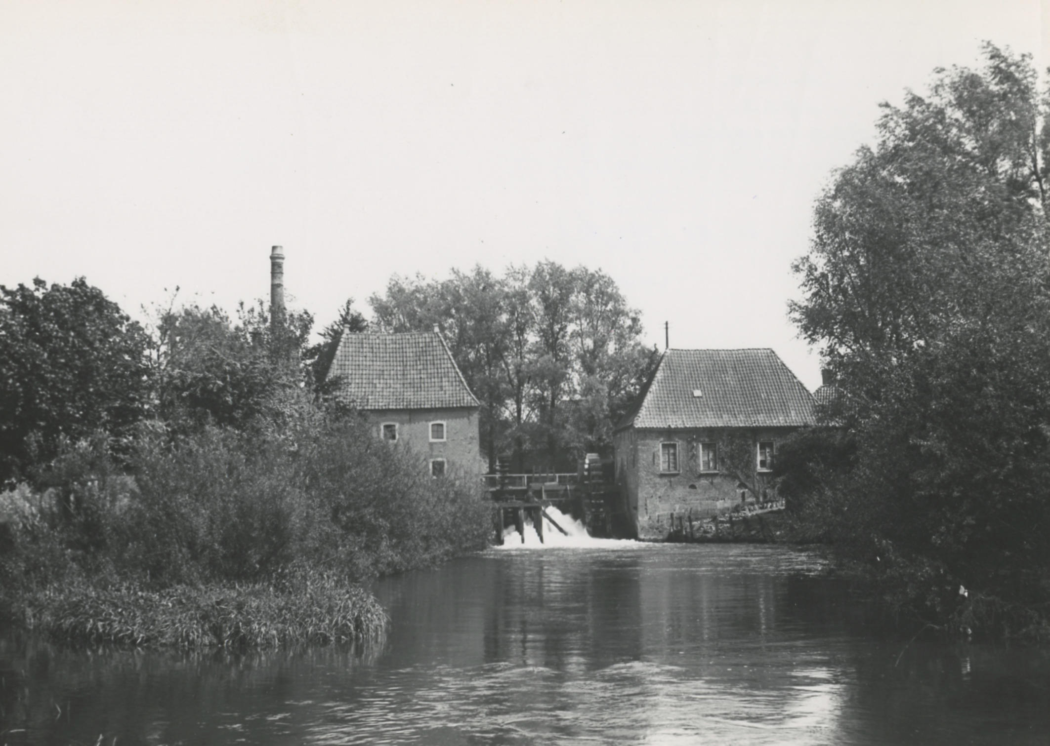 Onderslagwatermolen in Borculo. Het linker pand was oorspronkelijk een koren- en pelmolen en werd later verbouwd tot cichoreifabriek. In het rechter pand zat een oliemolen die in 1920 is verbouwd tot korenmolen. De watermolen ligt aan een zijtak van de Berkel.