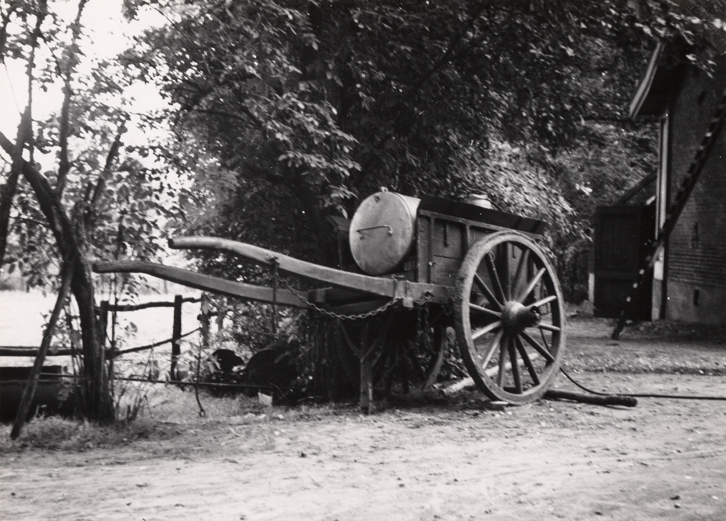 Tweewielige kiepkar met een verzinkt giervat tussen de zijleren bij boerderij Klein Warnsborn, ten noorden van Arnhem.