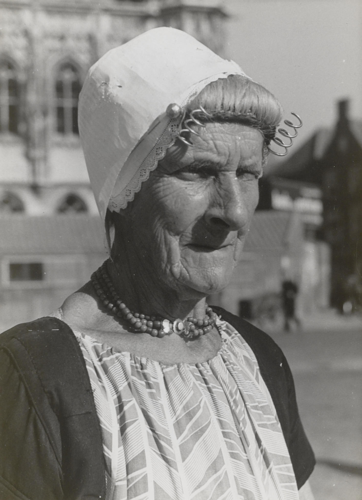 Vrouw in Walcherse dracht, Middelburg, 1947 (zwart-wit foto)