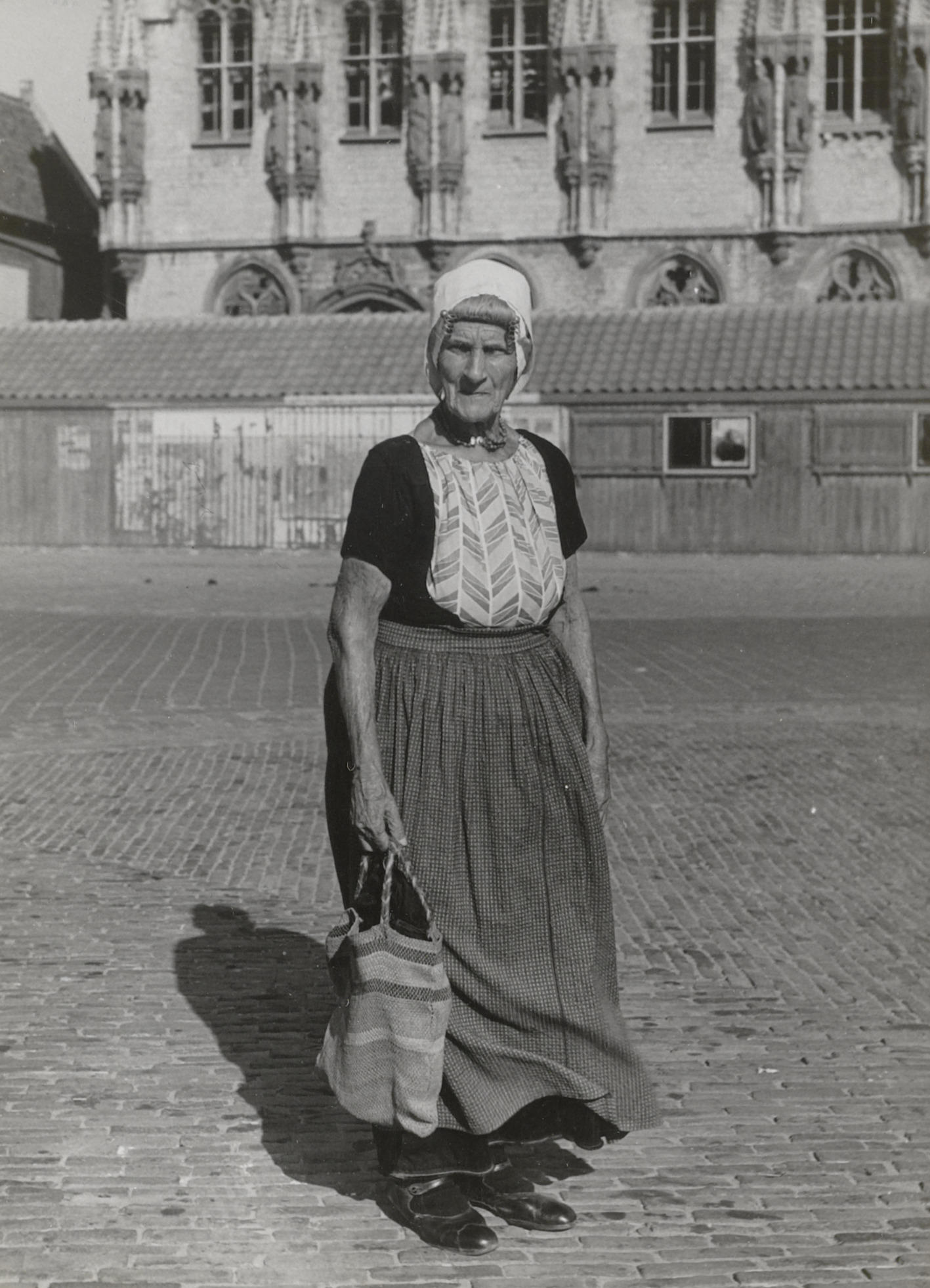 Vrouw in Walcherse streekdracht in Middelburg. De vrouw is gekleed in opknapdracht. Ze is voor haar tijd (1947) ouderwets gekleed.