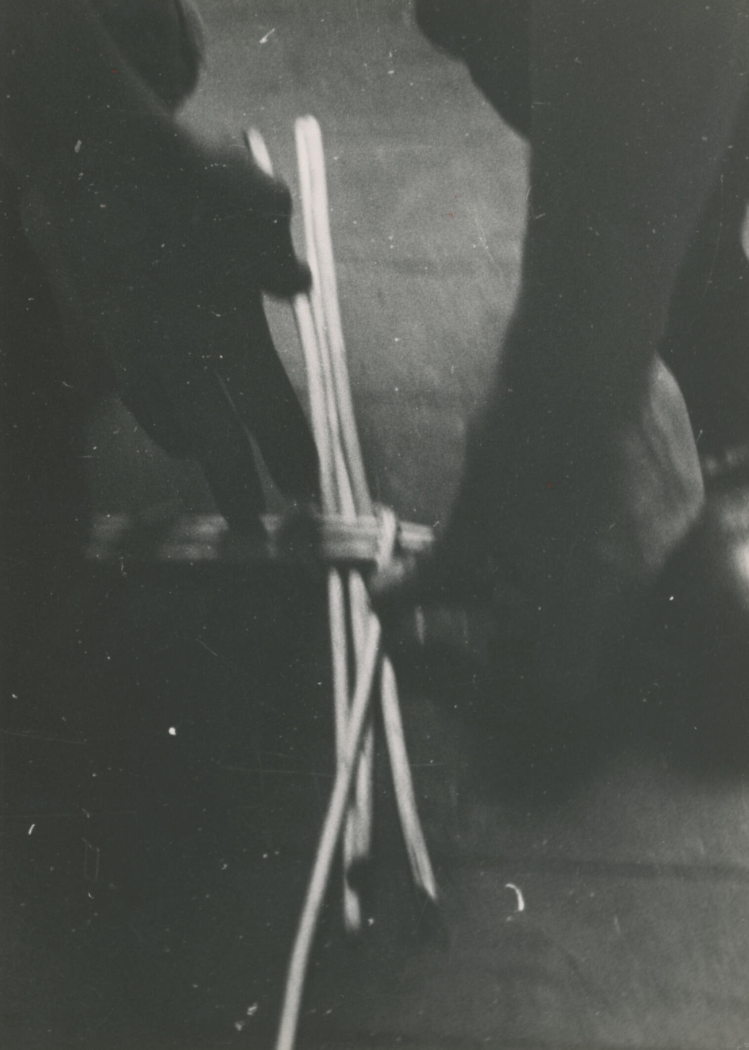 De eerste fase van het vlechten van een tenen mand. Enkele geschilde wilgentenen worden kruislings over elkaar gelegd. Dit is het begin van de bodem van de mand. Foto uit een reeks, gemaakt tijdens een demonstratie mandenmaken bij de Geldersche Blindenvereeniging in Arnhem.