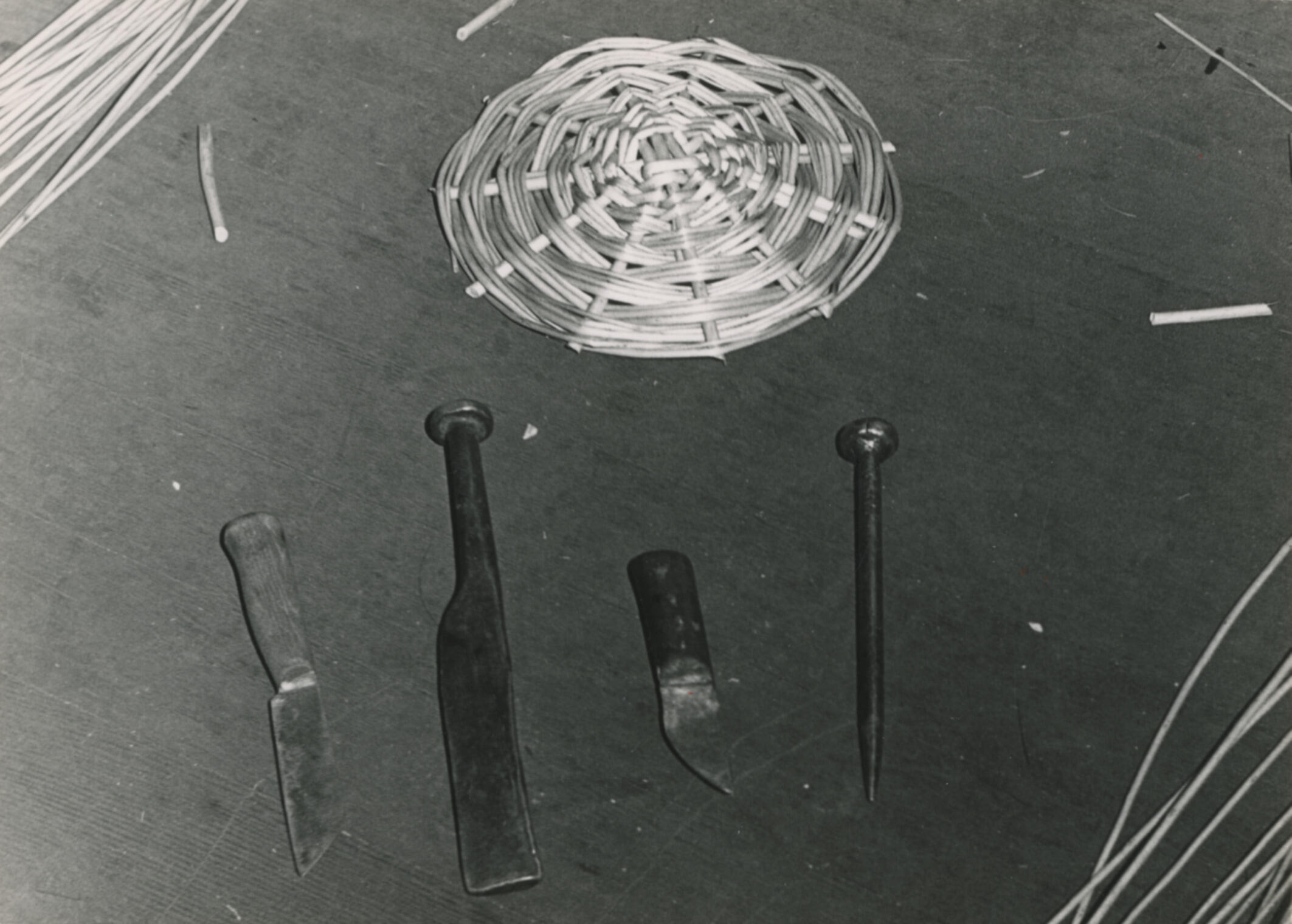 Een gevlochten bodem van een tenen mand. Enkele geschilde wilgentenen zijn kruislings over elkaar gelegd, waarna er wilgentenen om en om rond de uitstekende staken zijn gelegd. De uitstekende staken zijn vervolgens afgesneden. Op de voorgrond ligt mandenmakersgereedschap. Foto uit een reeks, gemaakt tijdens een demonstratie mandenmaken bij de Geldersche Blindenvereeniging in Arnhem.