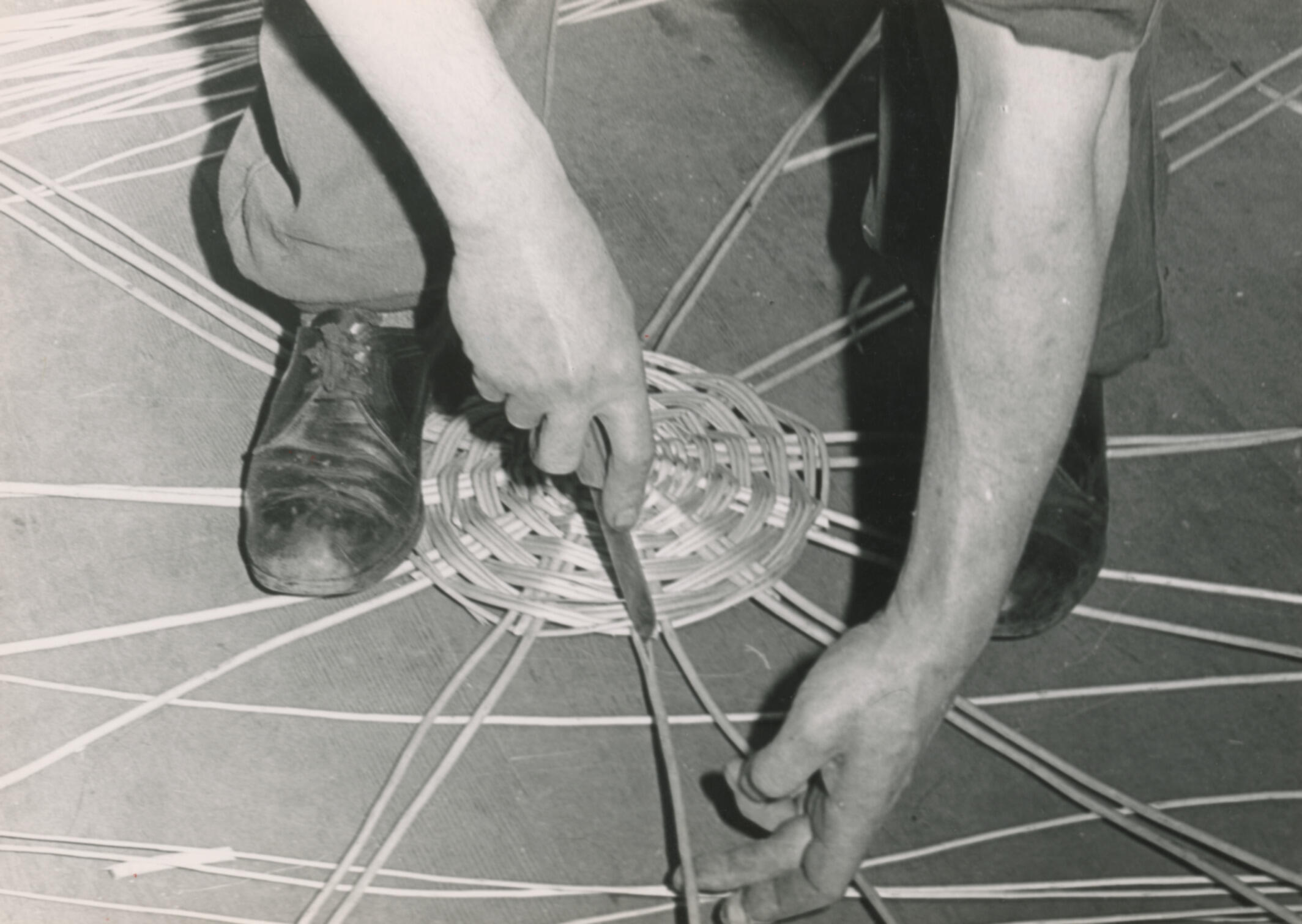 Het vlechten van een tenen mand. Als de bodem gereed is, worden rondom 23 staken in de bodem gestoken. Deze vormen de basis voor de zijkant van de mand. Met een scherp voorwerp maakt de mandenmaker een inkeping in iedere staak, zodat deze op dat punt omgebogen kan worden. Foto uit een reeks, gemaakt tijdens ...