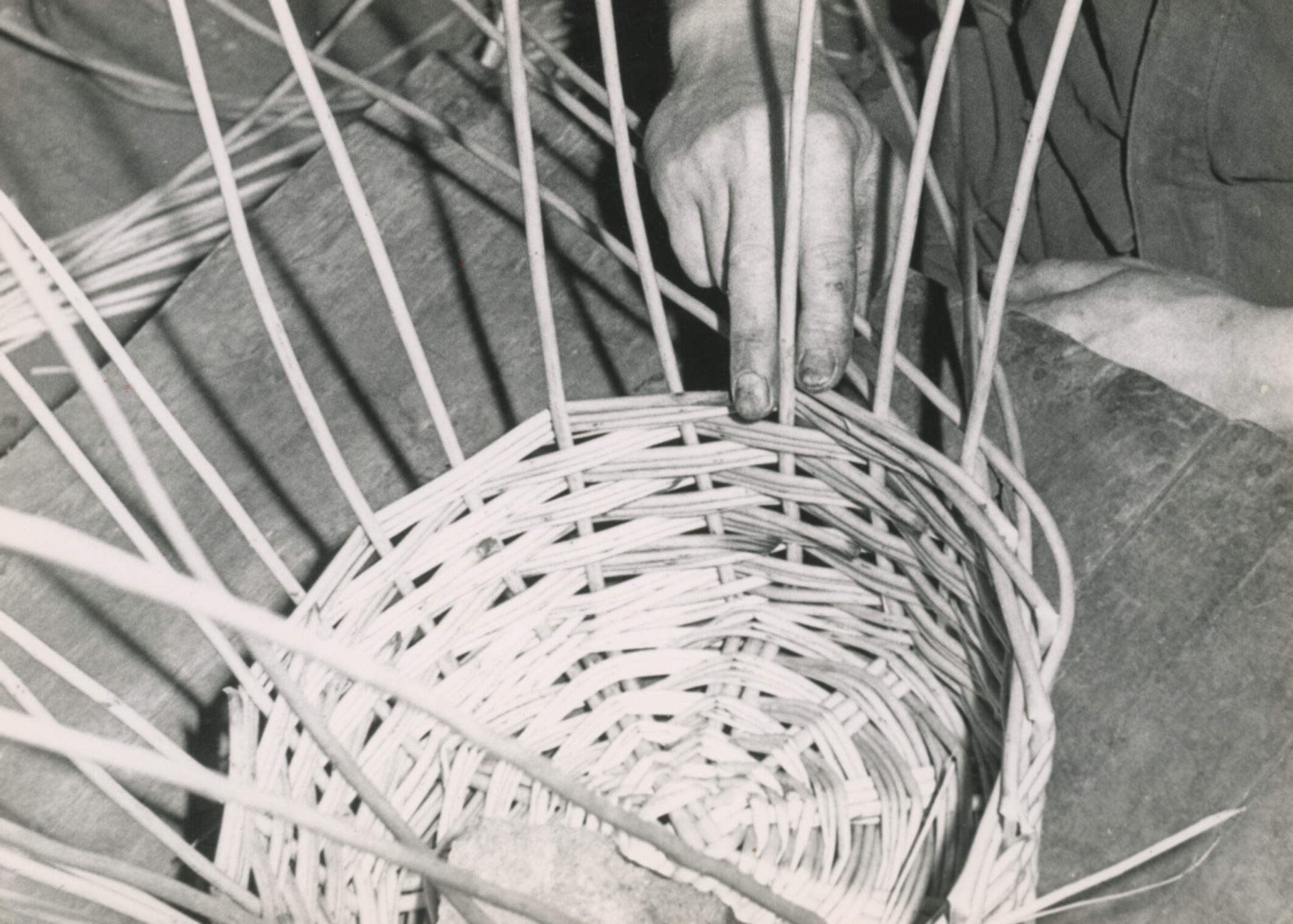 Het vlechten van een tenen mand. Als de bodem gereed is, worden rondom 23 staken in de bodem gestoken. Deze worden vervolgens omhoog gebogen en vormen zo de basis voor de zijkant van de mand. Daarna wordt de zijkant gevlochten. De mandenmaker vlecht de wilgentenen om en om rond de staken tot de mand de ...