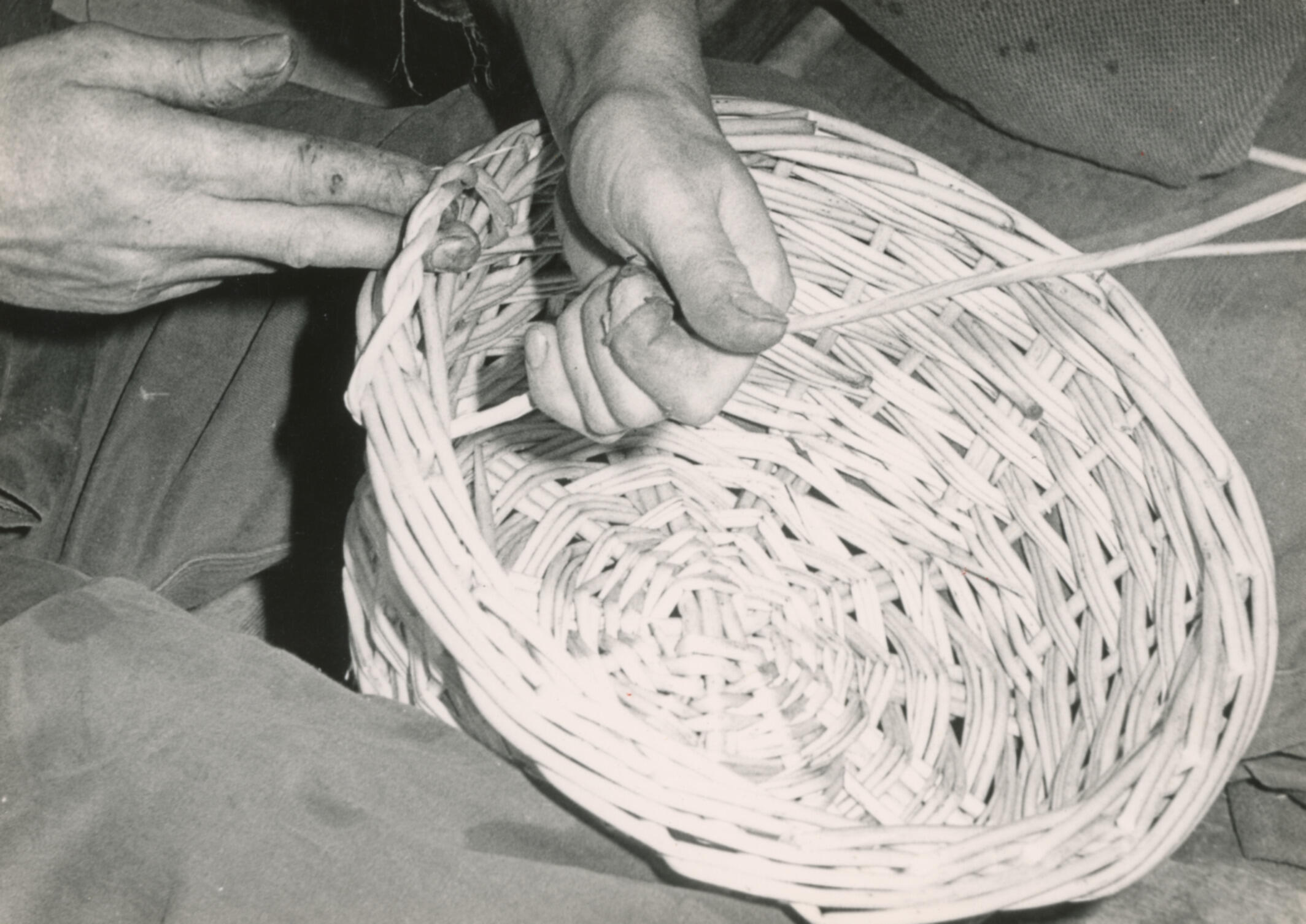 Het vlechten van een tenen mand. Als de bodem, de zijkant en de rand gereed zijn, worden er twee handvatten aan de rand gemaakt. Hiervoor wordt een staak in de rand gestoken. Nadat deze staak goed in elkaar gedraaid is, wordt deze verderop terug in de rand gestoken en rond de lus weer terug naar ...