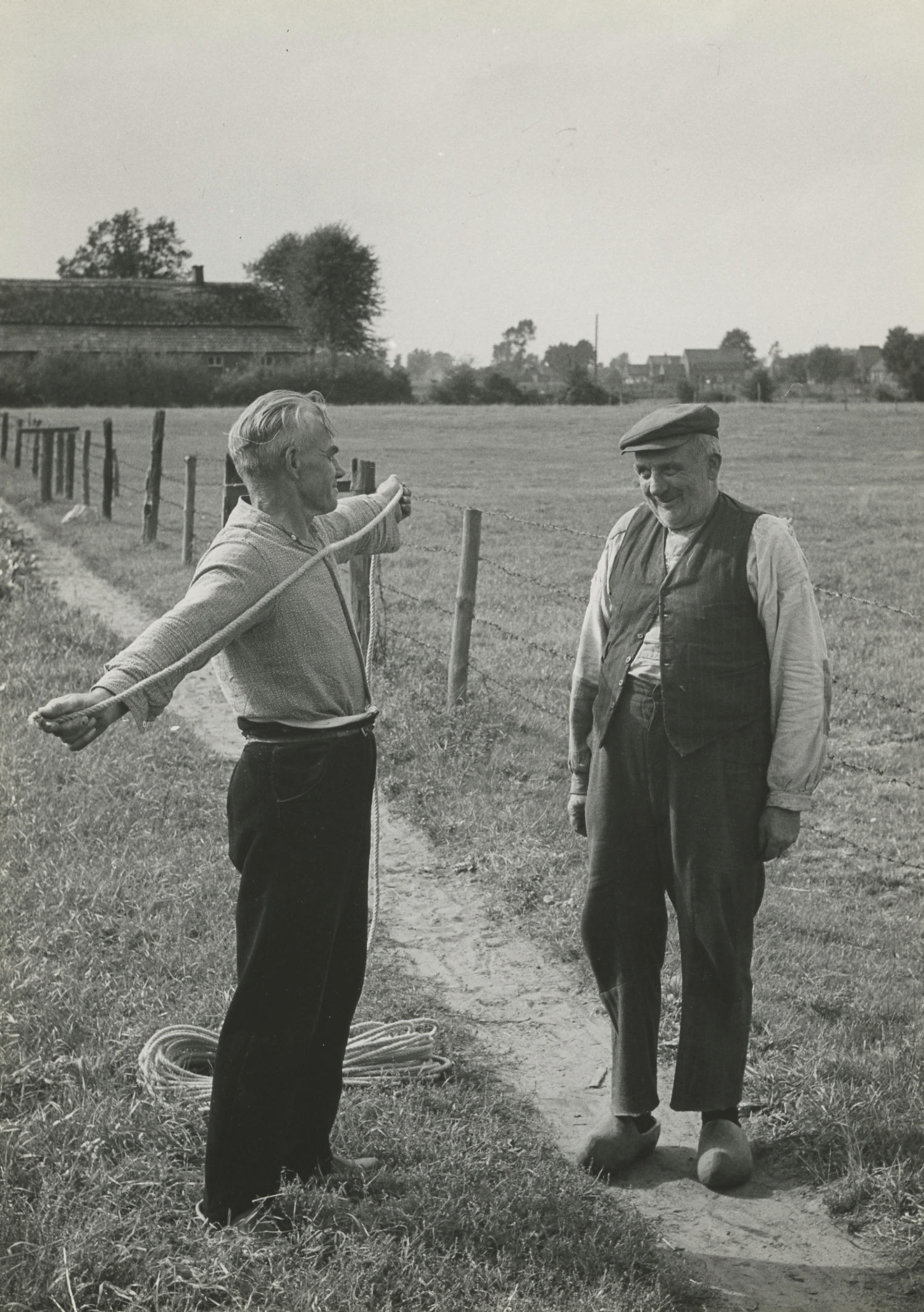 Het voltooide touw wordt door Driek Bloem per 'vaam' gemeten. Een vaam is de afstand tussen de toppen van de beide middelvingers bij zijwaarts uitgestrekte armen. Rechts staat overbuurman Brord van de Wiel. De foto is genomen bij de touwslagerij van Driek Bloem in Berghem, Noord-Brabant.