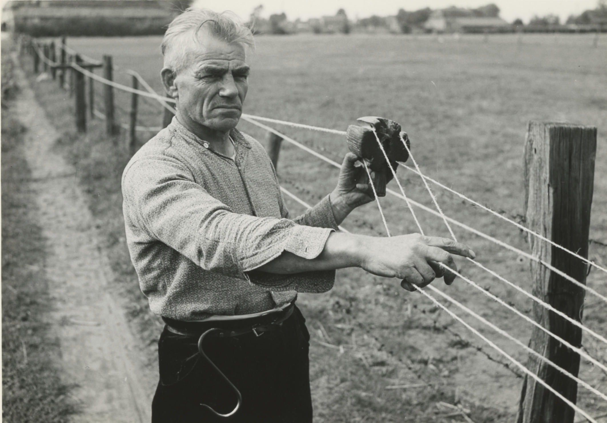 Het dichtklossen van vier gesponnen draden tot een streng door Driek Bloem. Langs de omheining van puntdraad hangen twee voltooide strengen. De foto is genomen bij de touwslagerij van Driek Bloem in Berghem, Noord-Brabant.
