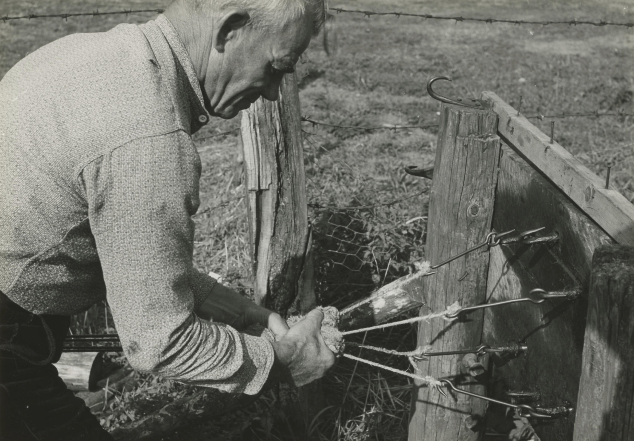 Driek Bloem maakt de strengen nat. De strengen zijn aan haken van het zogenoemde rondsel gehaakt. Het rondsel heeft een plank met vier haken aan de ene kant, die door middel van vier kleine tandwielen en een groot tandwiel aan de andere kant gelijkmatig in beweging worden gebracht. De foto is genomen bij de touwslagerij ...
