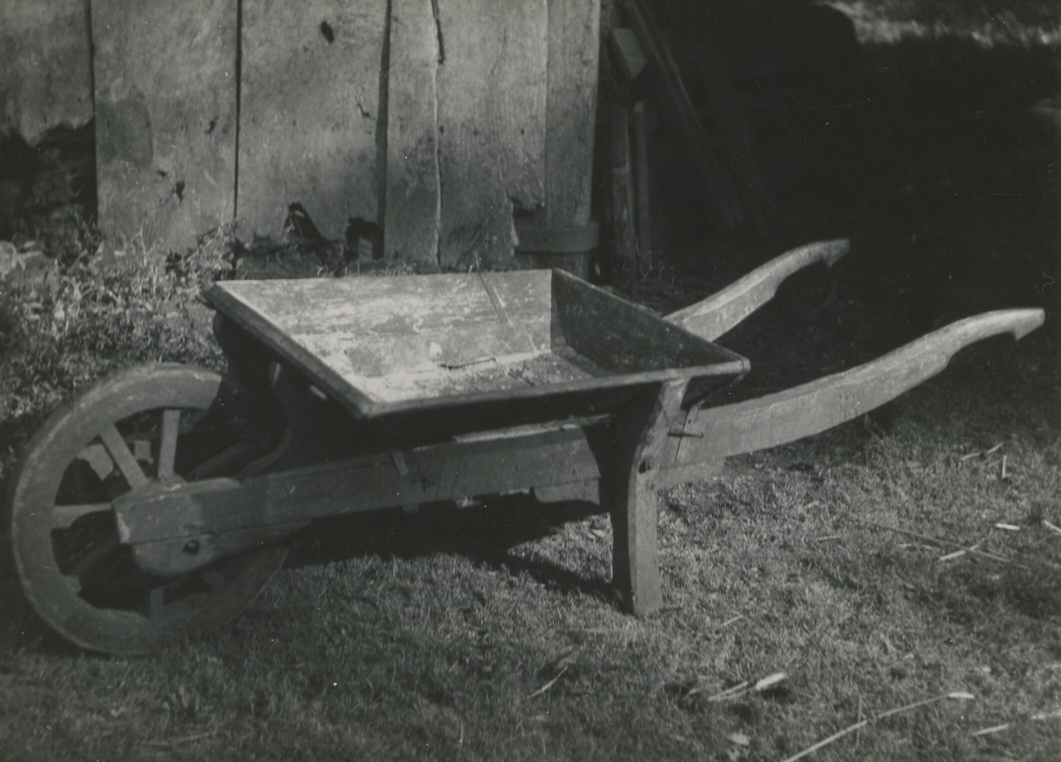 Houten kruiwagen, gebruikt voor het vervoer van zand en mest, gefotografeerd bij een boerderij in Oud-Schoonebeek (Middendorp).