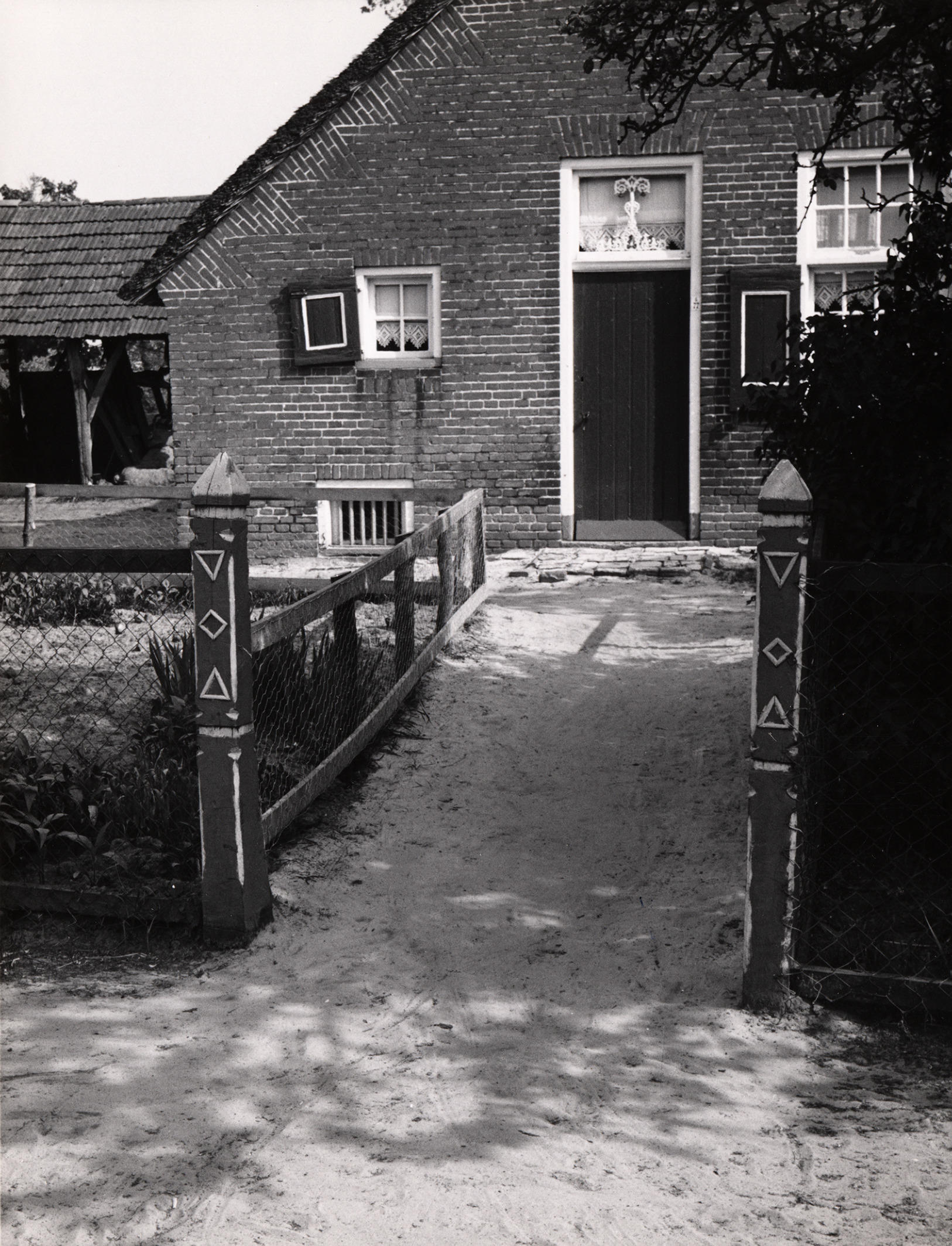 Versierde palen van een tuinhekje, Staphorst, 1959 (zwart-wit foto)
