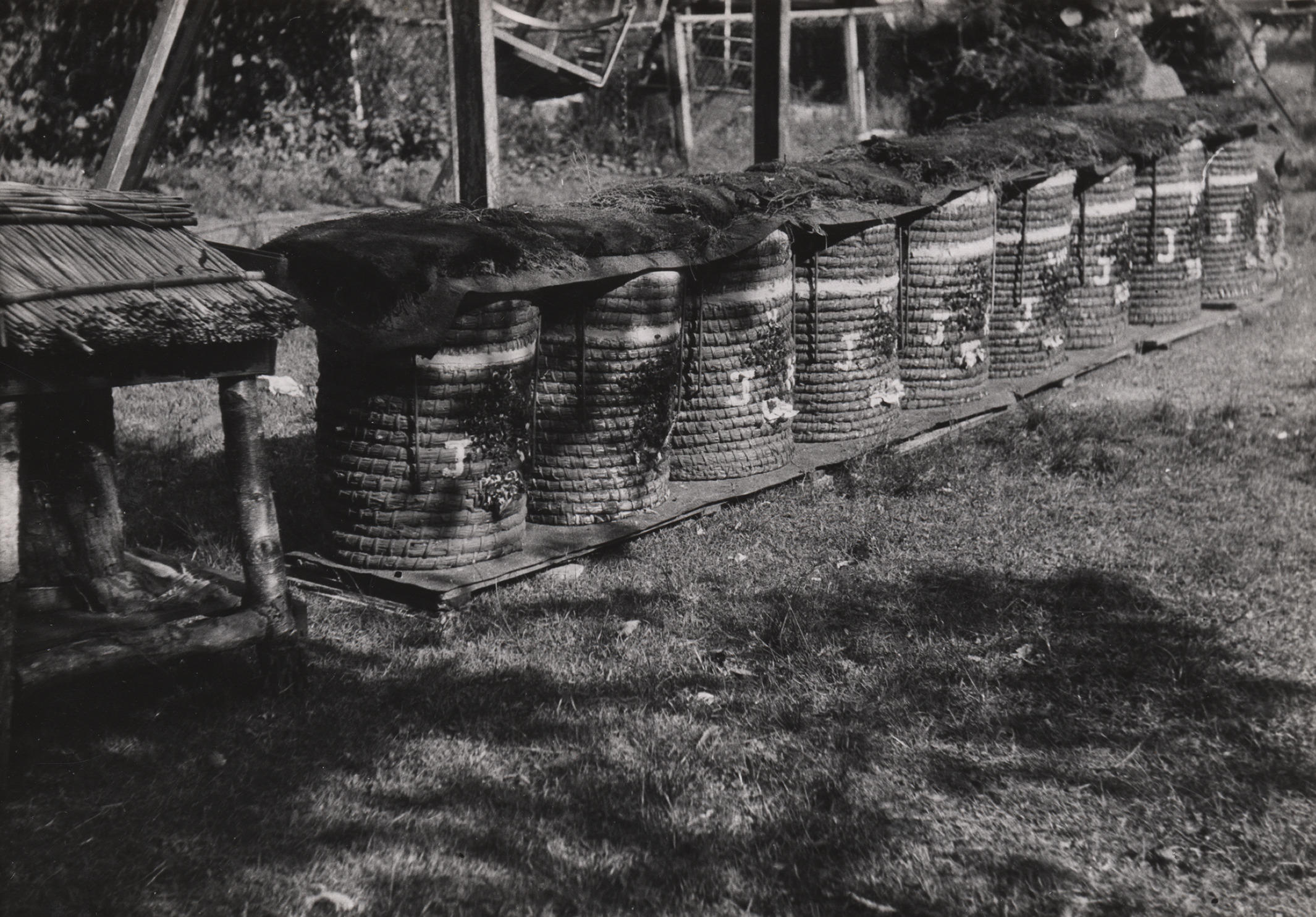 Bijenstand met zogenoemde boxmakorven. De korven zijn roodbruin geverfd en dragen de initialen JK. Ze zijn door J. Kalverkamp uit Assen ingezonden voor de tentoonstelling 'Bijen, bloemen en honing' die in 1947 in Assen werd georganiseerd.