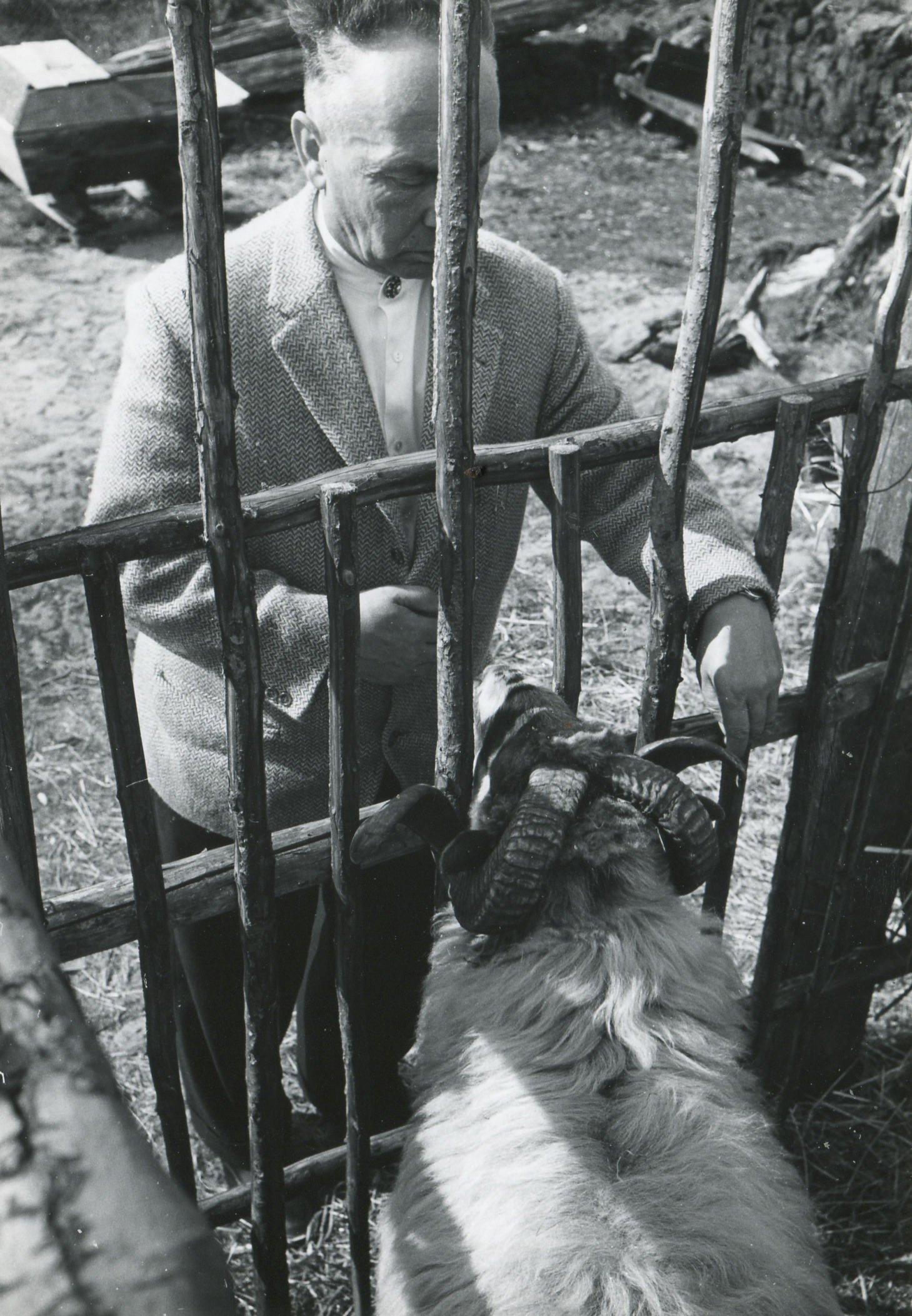 Man bij schapenhok in openluchtmuseum Schoonoord, 1959 (zwart-wit foto)