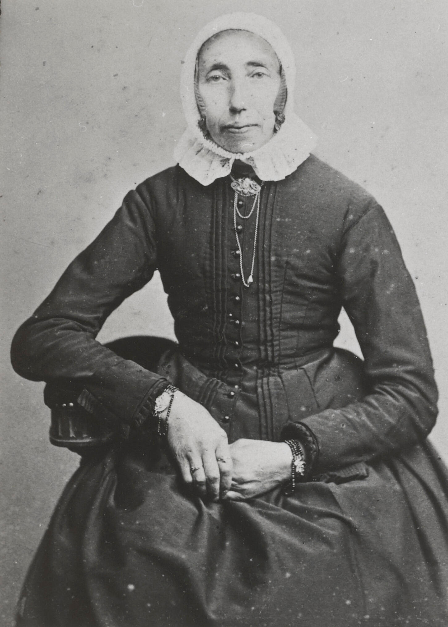 Vrouw in Drentse streekdracht uit Ruinerwold. De vrouw draagt een kornetmuts, waarvan de voorstrook het gehele gezicht omlijst. Onder deze muts draagt ze een gouden oorijzer met gouden stiften aan de uiteinden, de zogenoemde 'koeiekoppen'. Om haar hals heeft ze een gouden jasseronketting die met een gouden broche bijeengehouden wordt. Om de polsen draagt ze ...