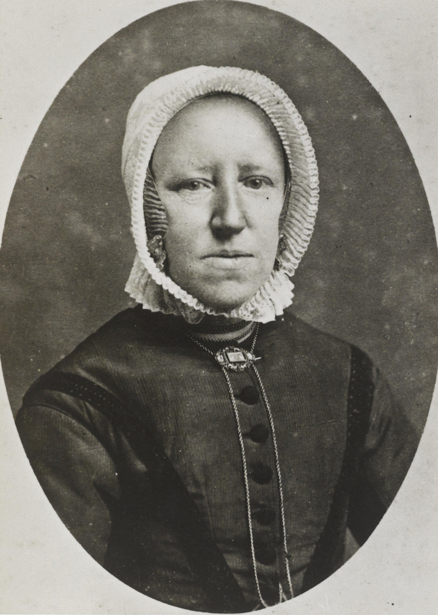 Annigje Preuper-Derks uit Ruinerwold, gekleed in Drentse streekdracht. Annigje draagt een kornetmuts waarvan de voorstrook het gezicht omlijst. Onder deze muts draagt ze een oorijzer met stiften (zogenoemde koeienkoppen) aan de uiteinden. Om haar hals draagt ze een jasseronketting die met een broche bijeengehouden wordt.