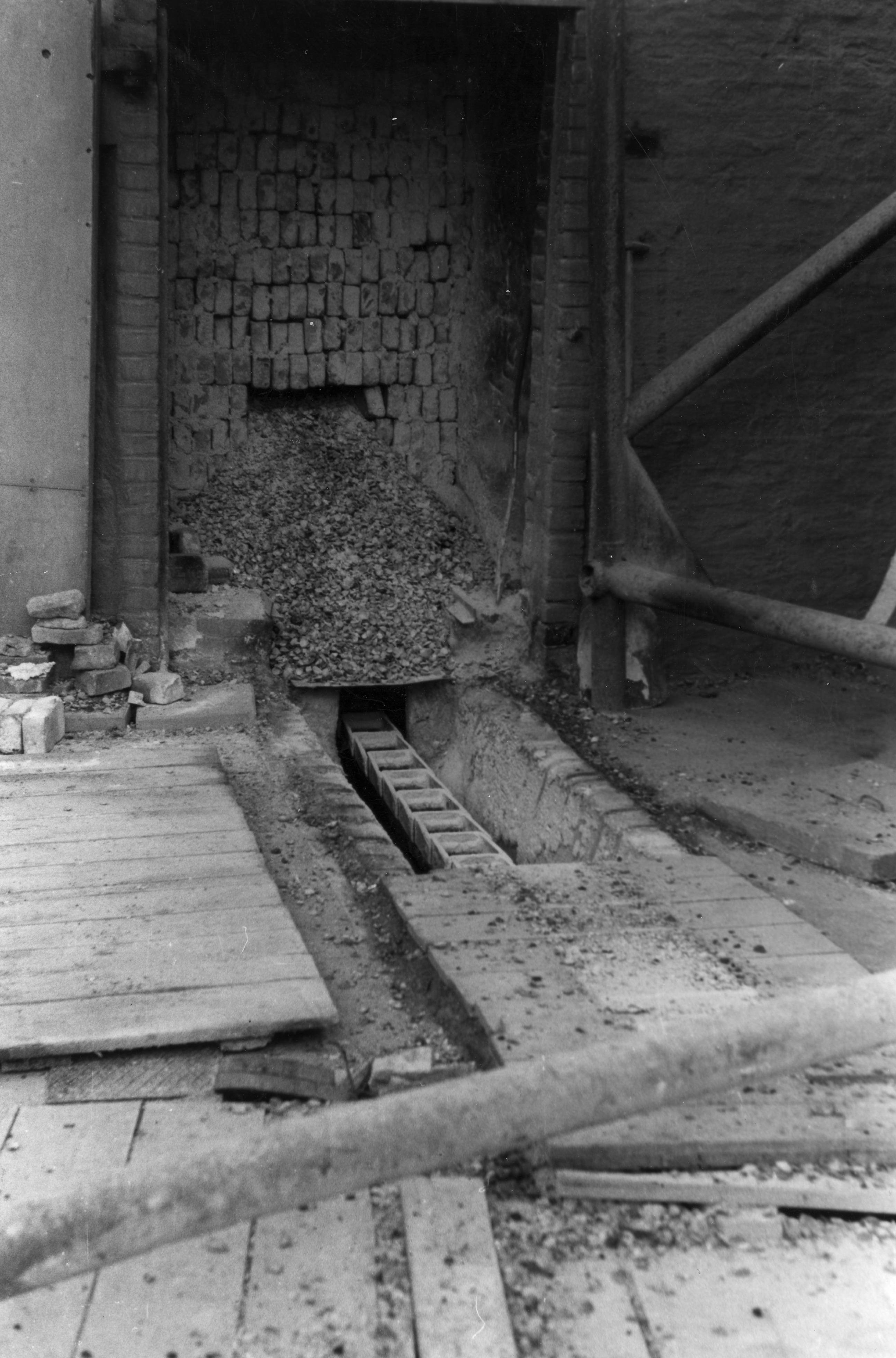 Een jakobsladder in de vloer bij schelpkalkbranderij Veenstra in Sneek. Met de jacobsladder worden de gebrande schelpen uit de oven naar het bluslokaal vervoerd. Bij een schelpkalkbranderij worden schelpen gebrand voor de fabricage van schelpkalk, een grondstof voor mortel. Schelpen bestaan uit calciumcarbonaat (CaCO3). De kalk (CaCO3) wordt in een kalkoven tot meer dan 1000 ...