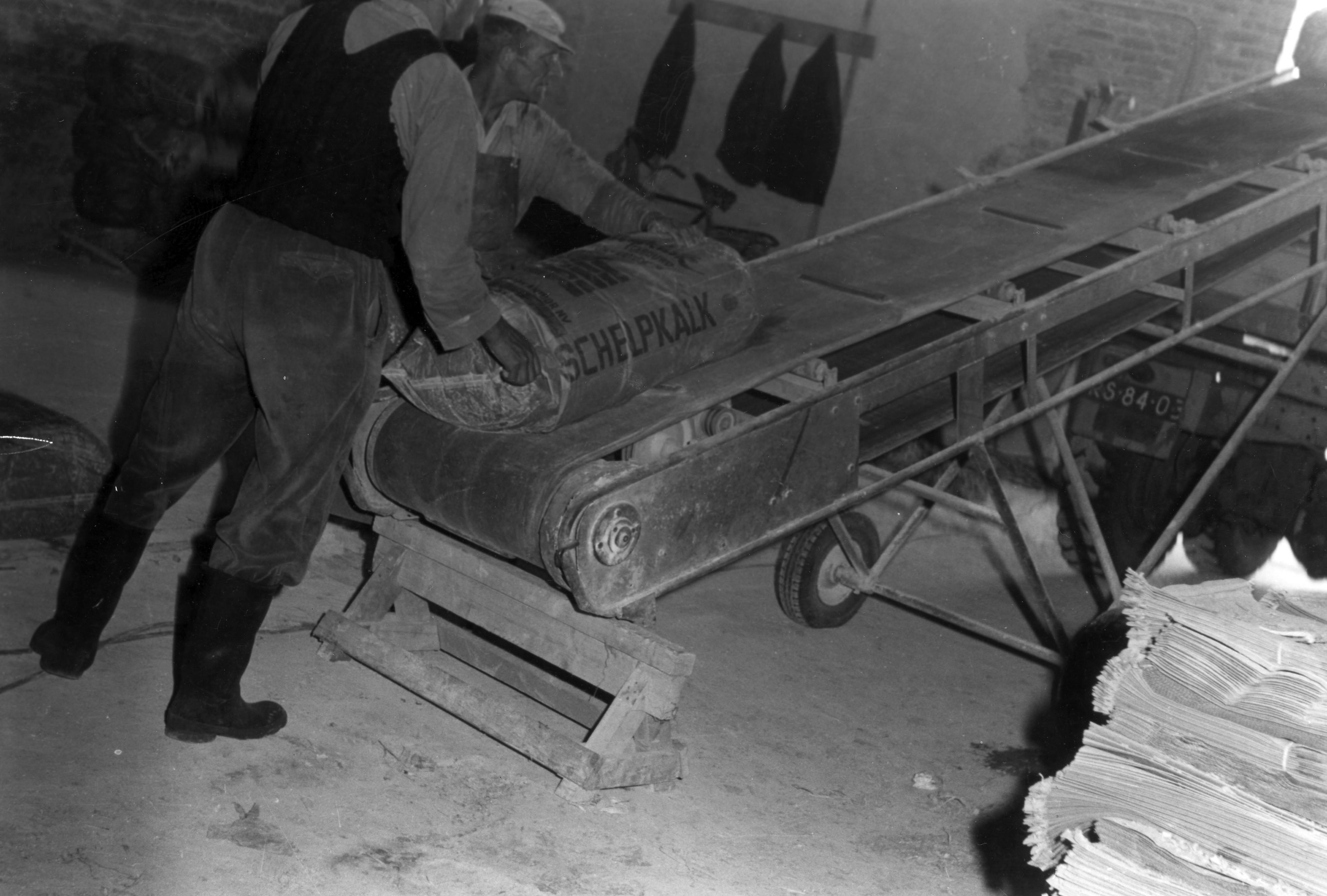 Het laden van een vrachtwagen bij schelpkalkbranderij Veenstra in Sneek. De zakken kalk worden met een transportband naar de laadbak van de vrachtwagen getransporteerd. Bij een schelpkalkbranderij worden schelpen gebrand voor de fabricage van schelpkalk, een grondstof voor mortel. Schelpen bestaan uit calciumcarbonaat (CaCO3). De kalk (CaCO3) wordt in een kalkoven tot meer dan 1000 ...