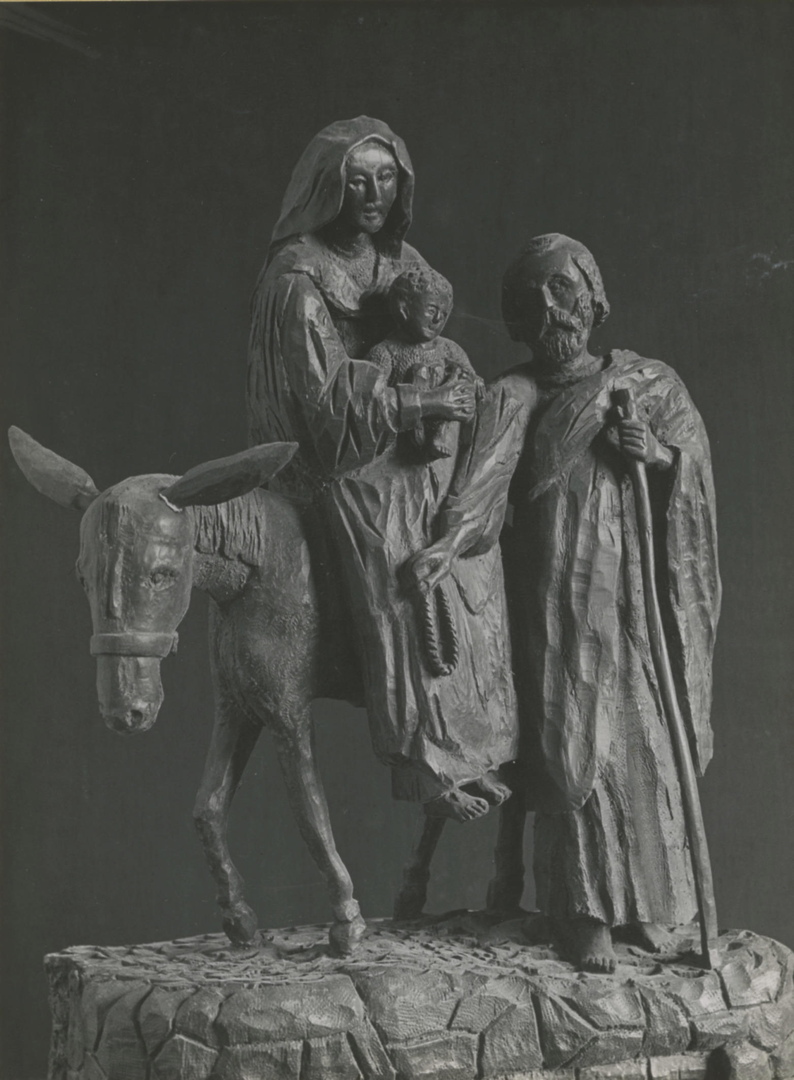 Eikenhouten beeld van de vlucht naar Egypte, vervaardigd door mijnwerker-beeldhouwer Nicolaus Duprez (1867-1949) uit Heerlen. Het beeld was in het bezit van pastoor H.J. Spiertz in Terwinselen.
