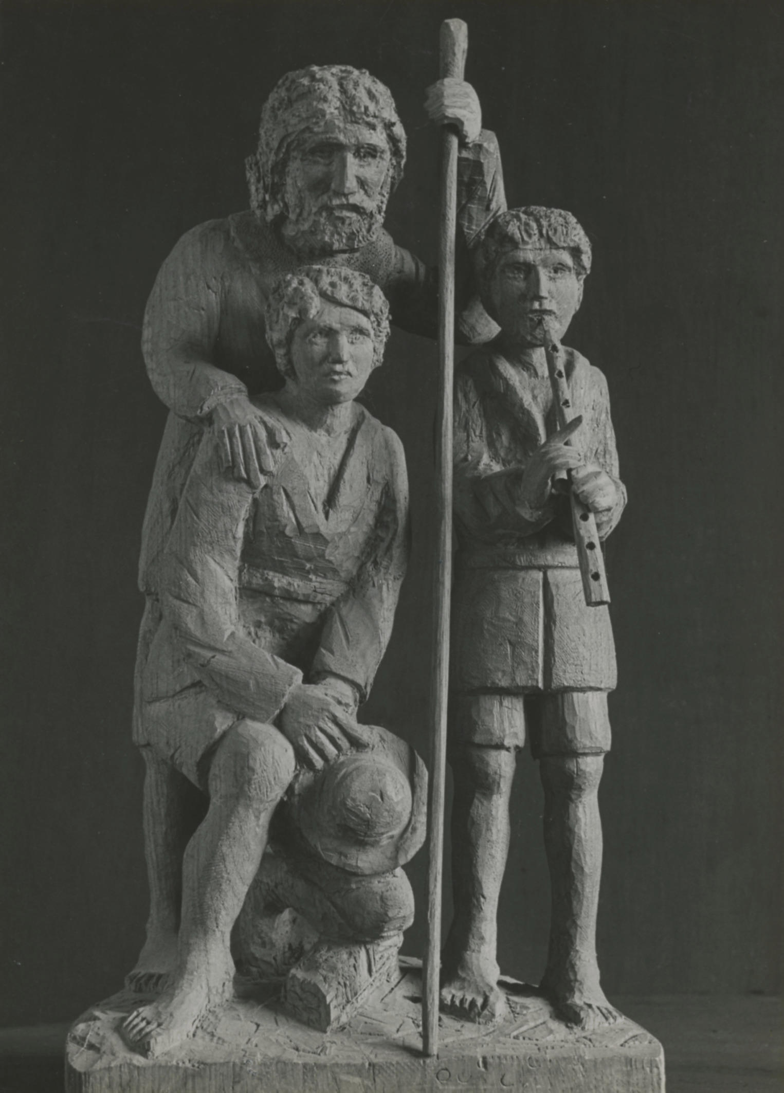 Eikenhouten beeld van drie herders, onderdeel van een kerstgroep, vervaardigd door mijnwerker-beeldhouwer Nicolaus Duprez (1867-1949) uit Heerlen. Het beeld was in het bezit van pastoor H.J. Spiertz in Terwinselen.