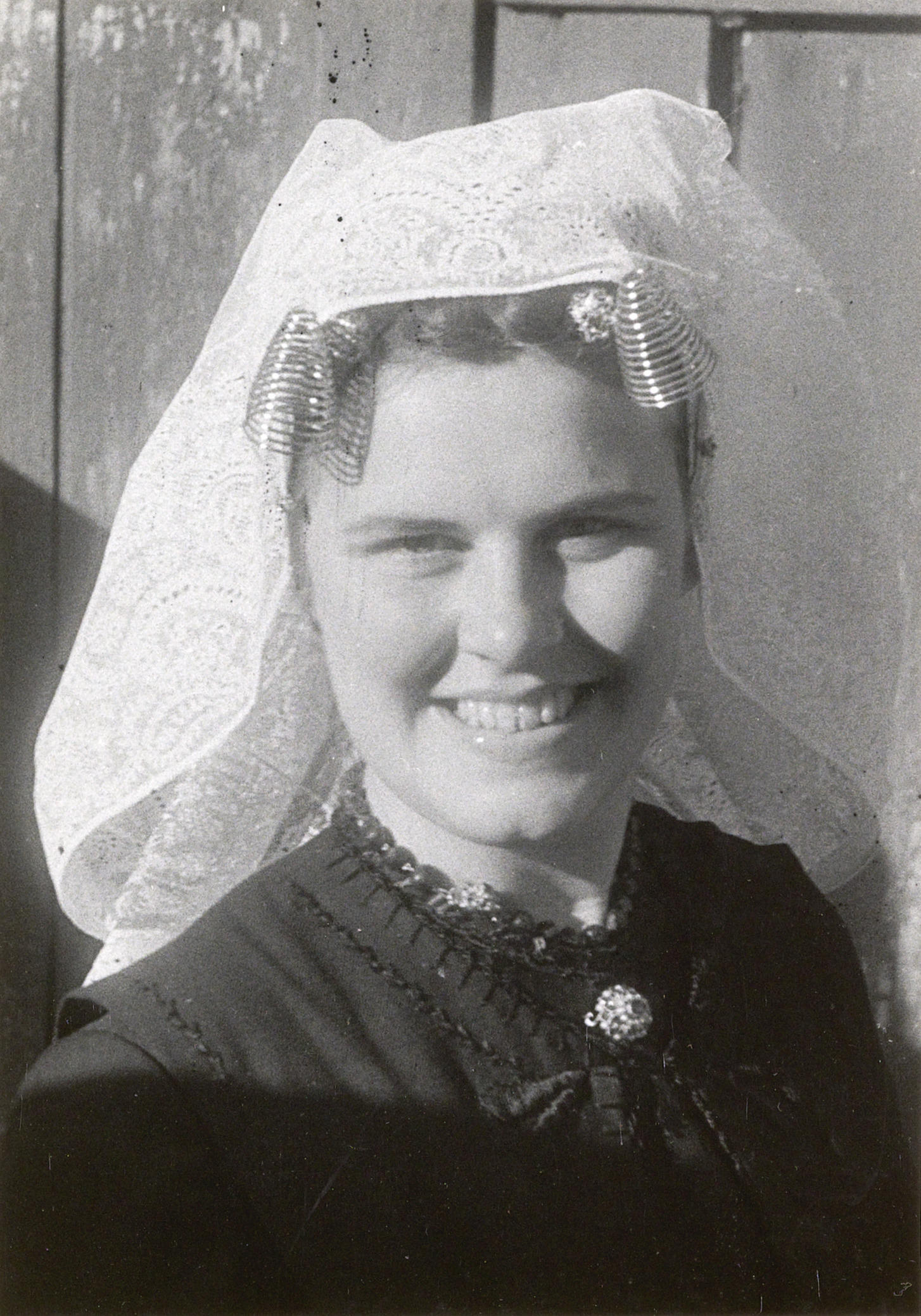 Vrouw, verkleed in de streekdracht van het eiland Goeree-Overflakkee. Toen deze foto in 1947 werd genomen werd deze dracht al niet meer door jonge vrouwen gedragen. In de zwarte ondermuts is een oorijzer gespeld met kegelvormige 'krullen' aan de uiteinden. Over de ondermuts draagt ze een sluiermuts, de zogenoemde keuvel. De Zuid-Hollandse sluiermuts is doorgaans ...