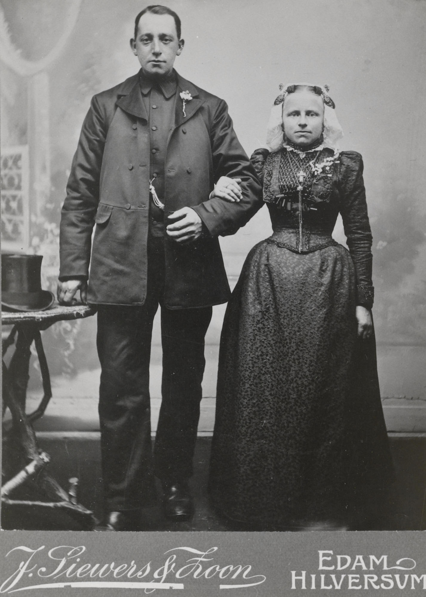Trouwfoto van Everharda de Boer-Hak en Wilhelmus de Boer uit Baarn, gemaakt in 1905. Het echtpaar De Boer is gekleed in Eemlandse streekdracht. Everharda draagt de zogenoemde staartkap. Wilhelmus heeft zijn hoge hoed op het tafeltje naast hem gelegd. Beiden dragen een corsage.