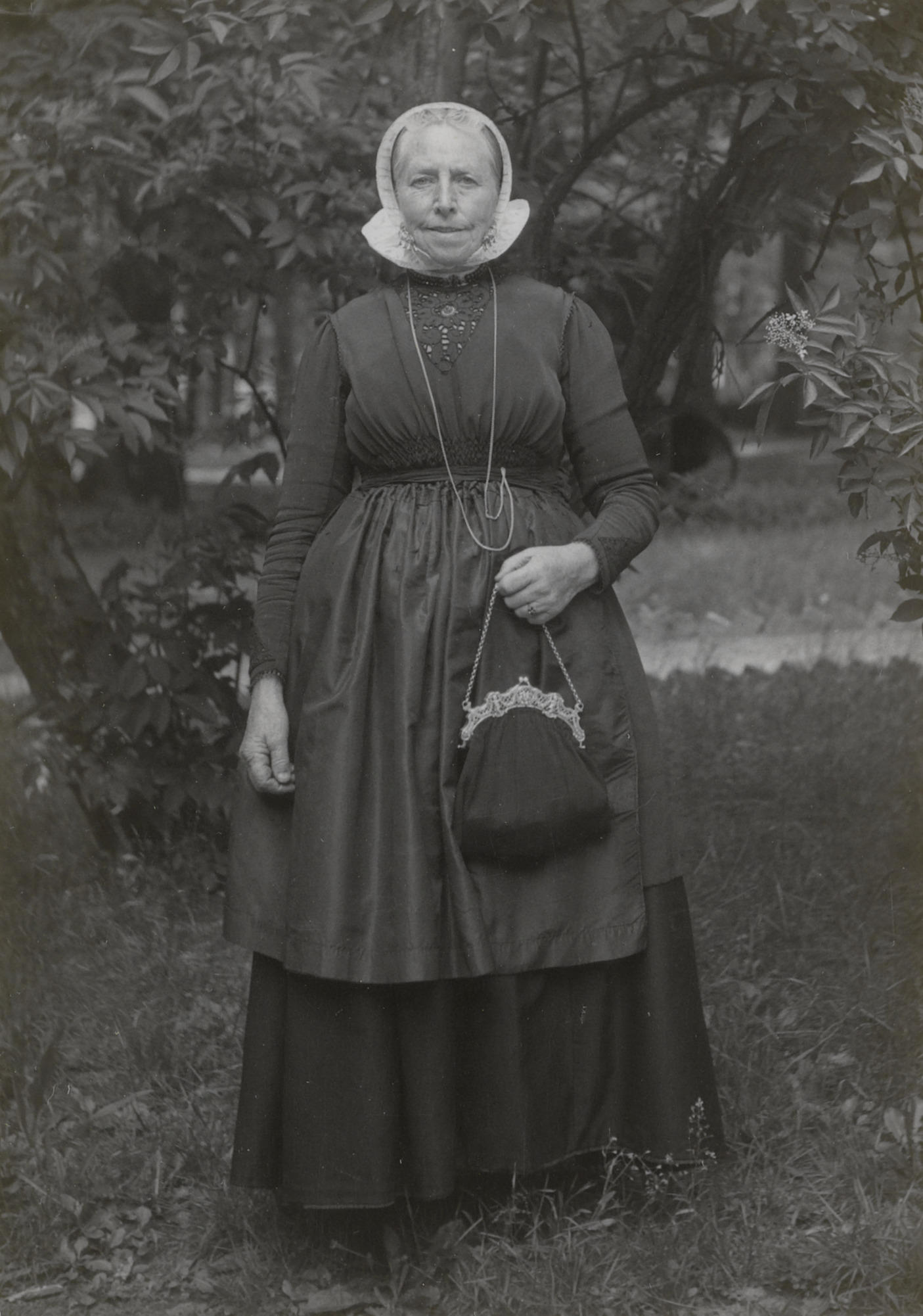 Mevrouw De Bruijne in Cadzandse streekdracht, op bezoek in het Nederlands Openluchtmuseum. Ze draagt een jak en rok met schort. Op haar hoofd heeft ze een kornetmuts met mutsenbellen in de voorstrook.