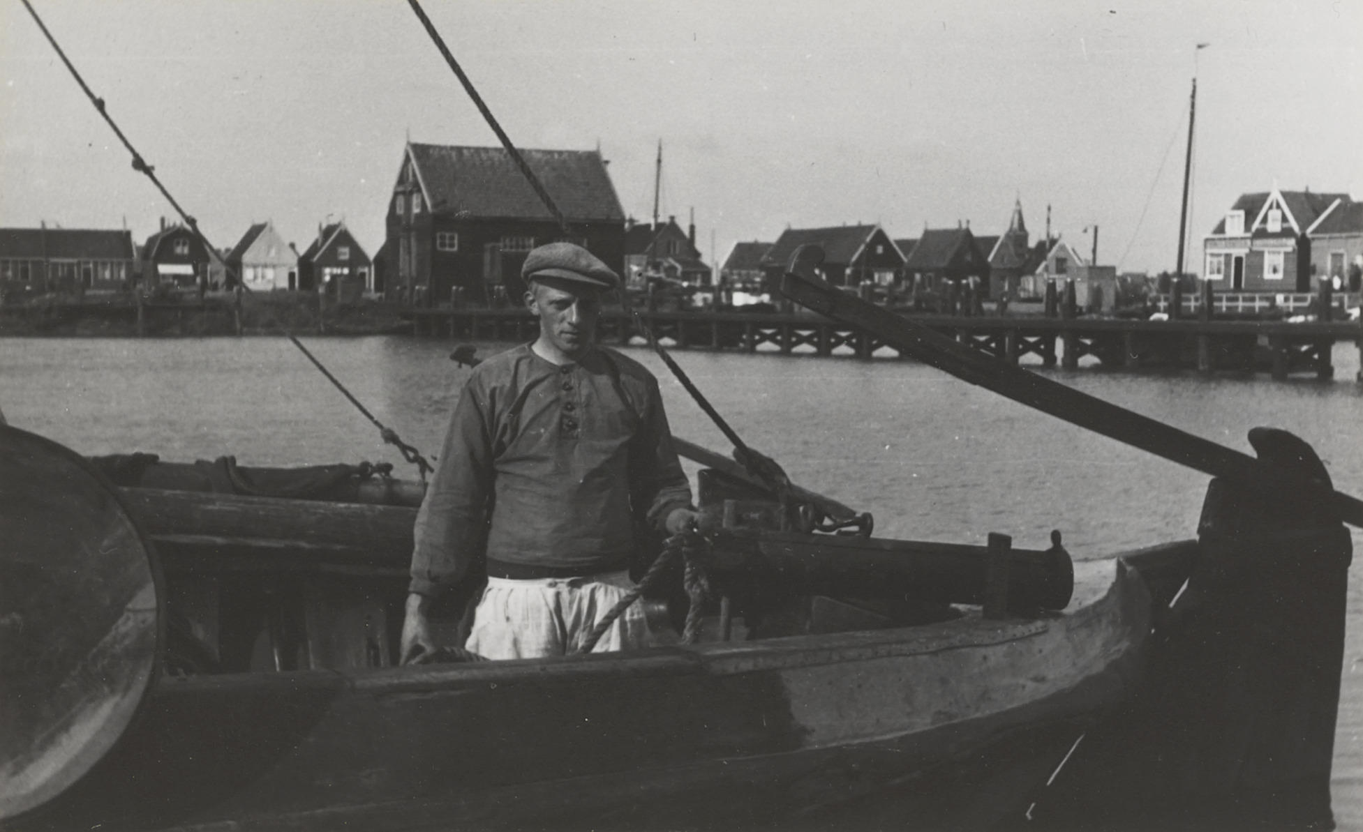 Vissersknecht Klaas Pereboom ('Kaatje') aan boord van een schip in de haven van Marken. Klaas is gekleed in Marker streekdracht. Hij draagt de daagse dracht voor de zomer. Op de achtergrond is de scheepshelling te zien die zich nu in het Nederlands Openluchtmuseum bevindt.