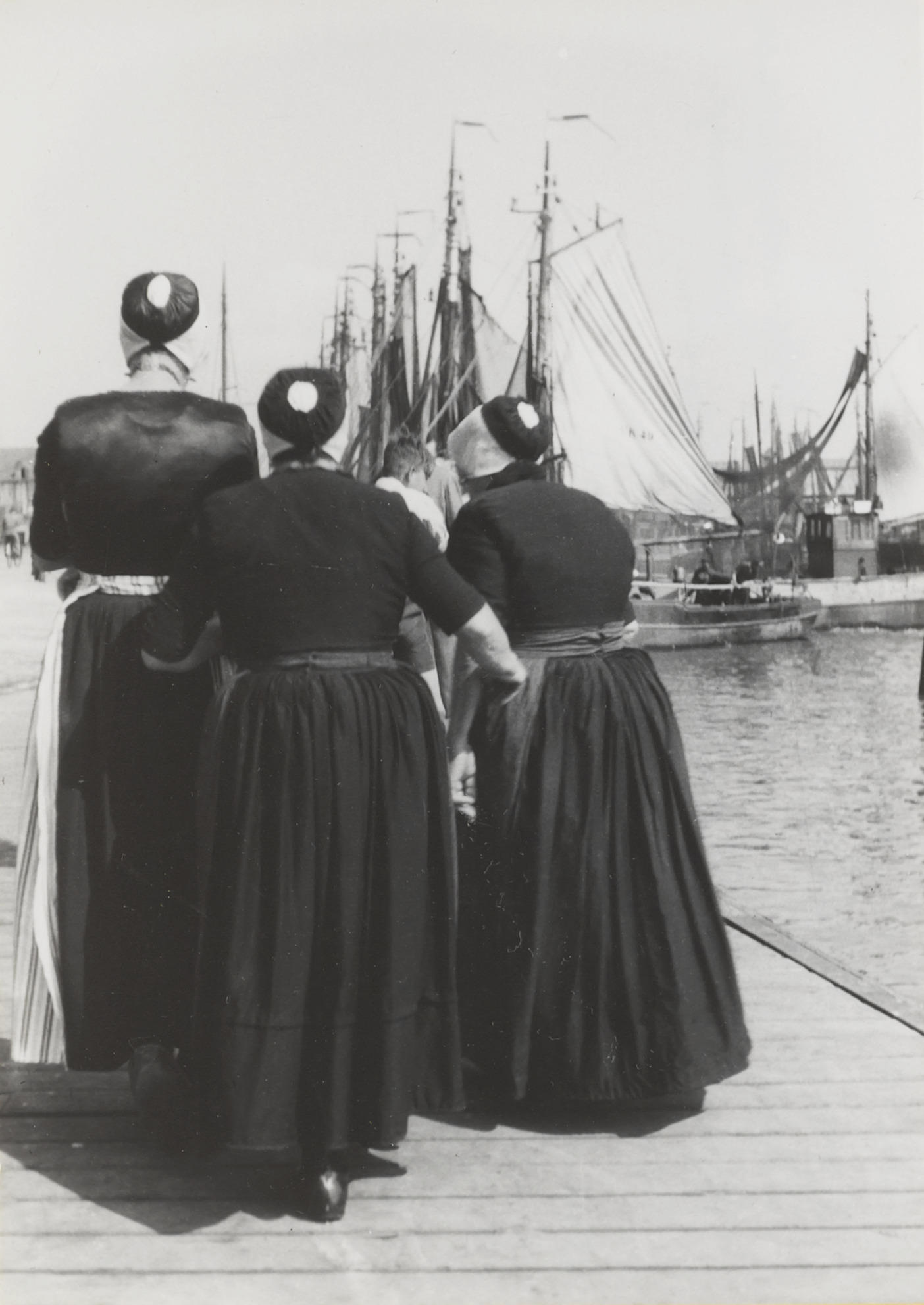 Drie vrouwen in Urker dracht bij de haven van Urk.